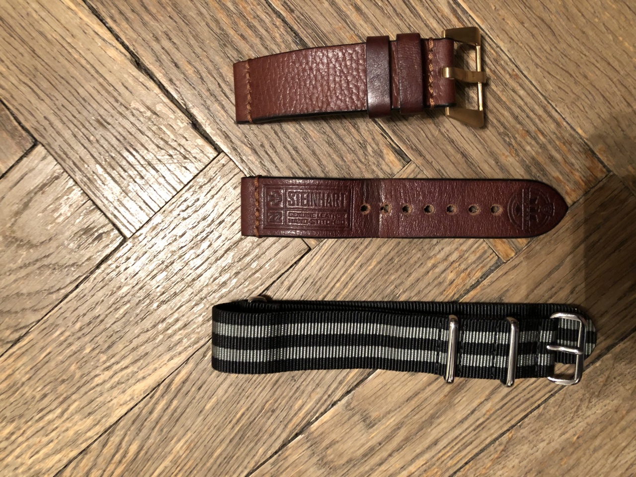 Так же имеется оригинальный кожаный коричневый ремешок, бакля там сейчас другая стоит, поменяю. И натовский.
