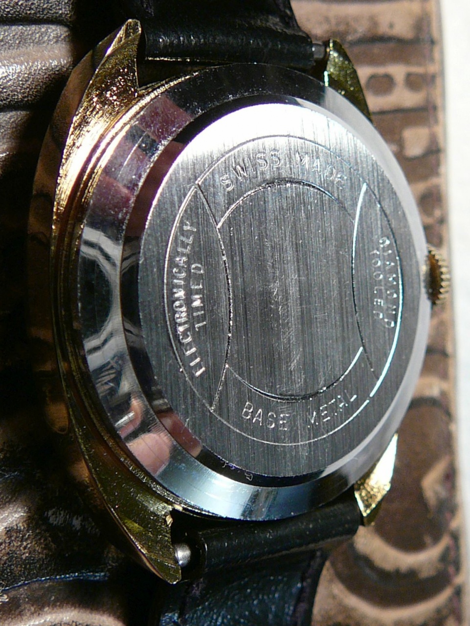 Надписи на крышке часов - "Base metal", "Electronically timed", "Swiss made" и "Diamond tooled".