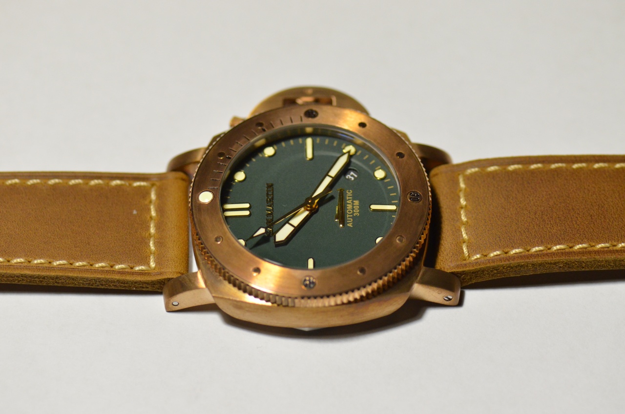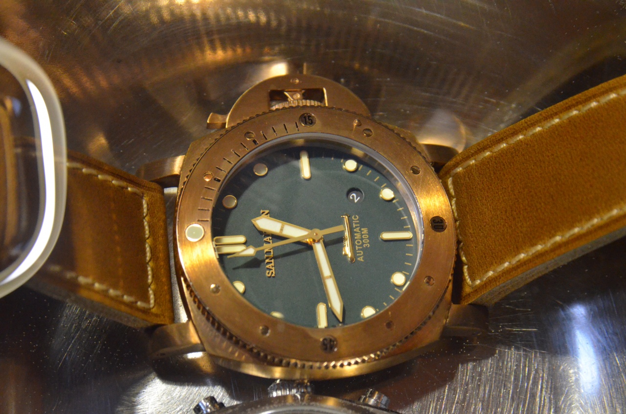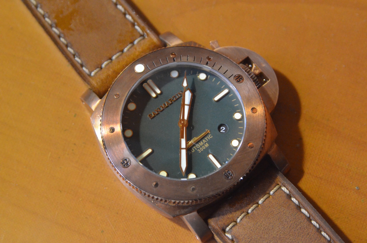 Над циферблатом установлено стекло из сапфира. Циферблат матового глубоко зеленого цвета, имеет нанесенные краской цвета бронзы минутные отметки, надпись Automatic, 300m. Часовые отметки накладные, в золотой оправке находится состав люминофора кремового цвета, и хорошего качества. Присутствует на циферблате объемная надпись San Martin выполненная шрифтом с засечками(вроде Geogia), а также рельефное изображение подводной лодки. Окошко даты круглое, без декора.диск даты черный. Стрелки золотые с нанесенным на них люминофором, по цвету немного светлее чем на часовых отметках. Механизм точно 28000 колебаний, производитель предлагает PT5000/SW200.(какой в моем варианте, не знаю) Завода на 40 оборотов хватило почти на двое суток. Заводная головка из того же сплава, что и корпус, не на резьбе. Усилие, которое оказывает защитная скоба, на мой взгляд недостаточно, чтобы уверенно погружаться, подвергая часы давлению в 30 атмосфер. Чтобы перевести дату или стрелки, заводную головку приходится вылавливать с большим трудом. Сверху, безель не позволяет ухватиться, а снизу почти не за что зацепиться. Даже в дешевых Custom made one of edition, эта проблема решена более изящно. Я решил эту проблему с помощью пластиковой карты, аккуратно поддев головку снизу.