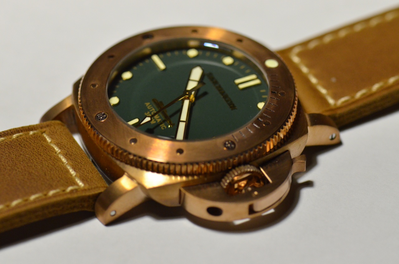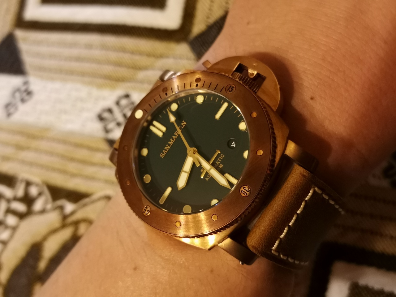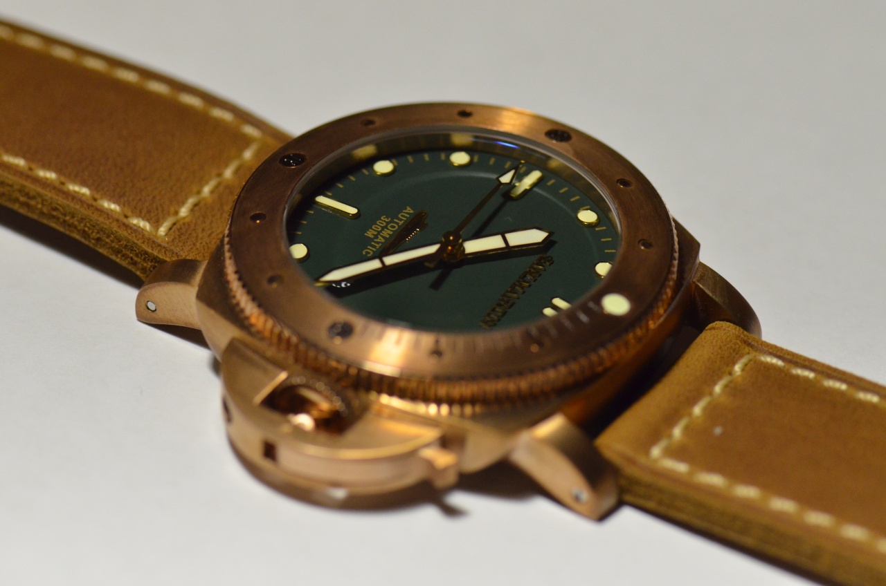 Над циферблатом установлено стекло из сапфира. Циферблат матового глубоко зеленого цвета, имеет нанесенные краской цвета бронзы минутные отметки, надпись Automatic, 300m. Часовые отметки накладные, в золотой оправке находится состав люминофора кремового цвета, и хорошего качества. Присутствует на циферблате объемная надпись San Martin выполненная шрифтом с засечками(вроде Geogia), а также рельефное изображение подводной лодки. Окошко даты круглое, без декора.диск даты черный. Стрелки золотые с нанесенным на них люминофором, по цвету немного светлее чем на часовых отметках. Механизм точно 28000 колебаний, производитель предлагает PT5000/SW200.(какой в моем варианте, не знаю) Завода на 40 оборотов хватило почти на двое суток. Заводная головка из того же сплава, что и корпус, не на резьбе. Усилие, которое оказывает защитная скоба, на мой взгляд недостаточно, чтобы уверенно погружаться, подвергая часы давлению в 30 атмосфер. Чтобы перевести дату или стрелки, заводную головку приходится вылавливать с большим трудом. Сверху, безель не позволяет ухватиться, а снизу почти не за что зацепиться. Даже в дешевых Custom made one of edition, эта проблема решена более изящно. Я решил эту проблему с помощью пластиковой карты, аккуратно поддев головку снизу.