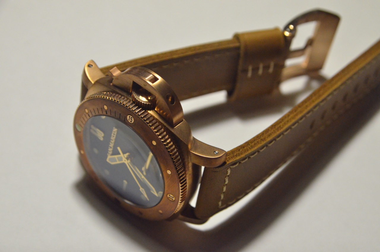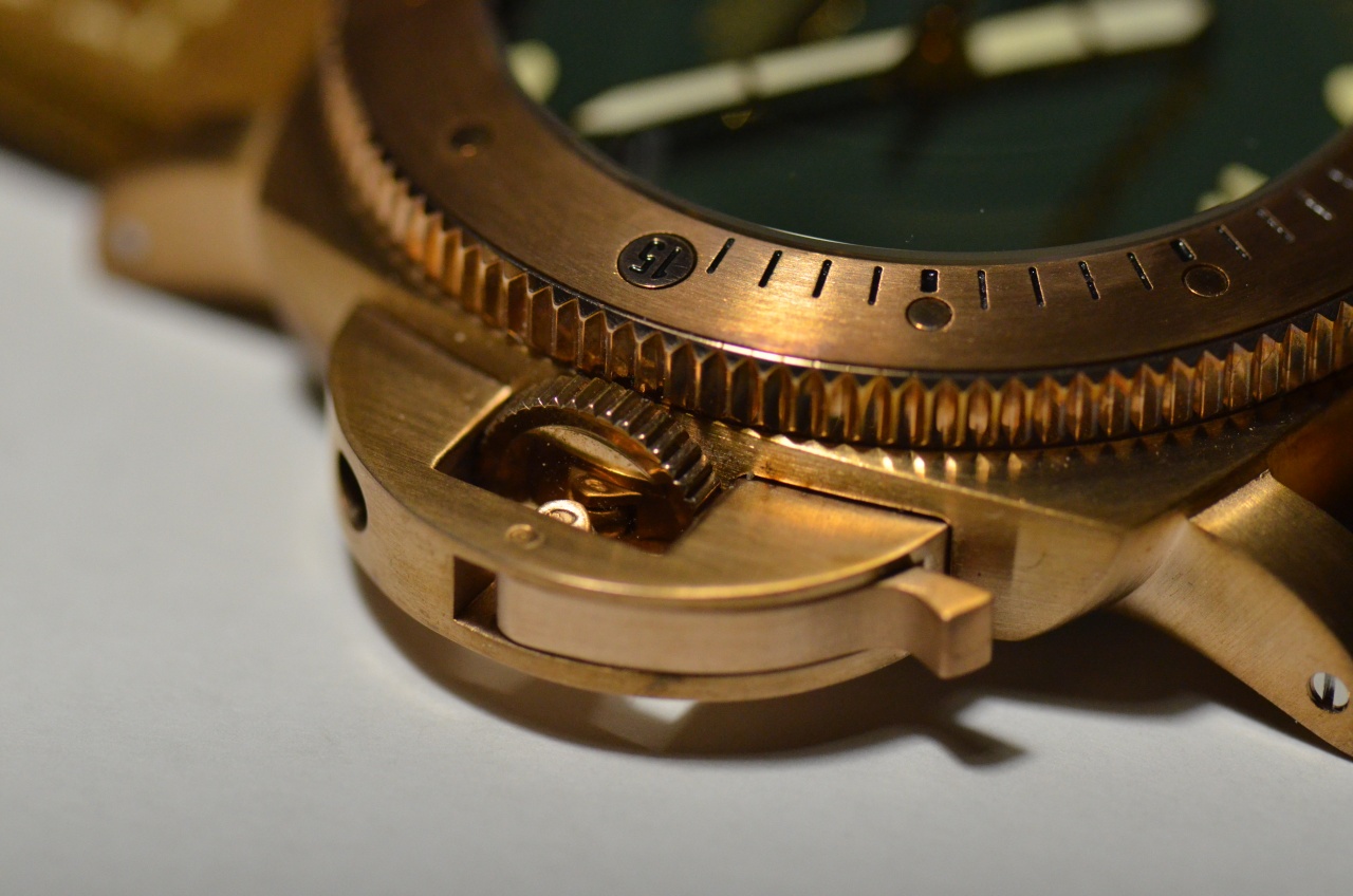 Корпус, безель, бакля и защитная скобы выполнены из медного сплава, имеющего очень близкие цветовые оттенки, но несколько разную степень окисления. Безель наиболее подвергся атмосферному влиянию. Корпус изготовлен достаточно аккуратно, поверхность верхней части имеет среднее круговое сатинирование, по бокам сатинирование продольное. Скоба защиты имеет мелкое сатинирование, почти незаметное. Безель с верхней части имеет крупное круговое сатинирование и полированные метки с маркировкой 15,30,45. Безель имеет 120 щелчков полного оборота. Заусенцев, задиров металла не обнаружено. Производитель утверждает, что для изготовления корпуса использовался сплав CUSN8. По цвету такой же сплав использовался в их модели авиаторов.(больших)