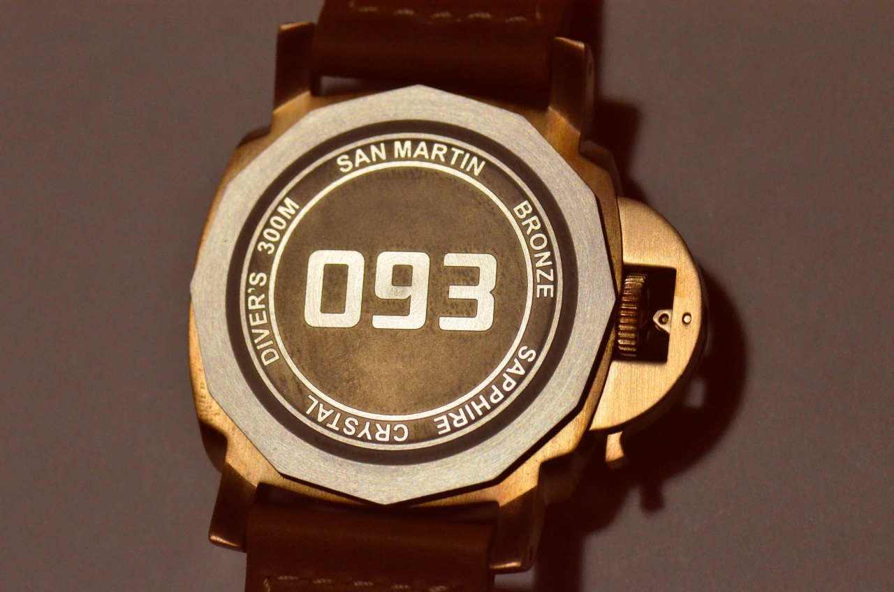 Ремешок с часами поставляется кожаный, сложаный, склееный и прошитый из однослойной кожи. Ощущается мощный запах кожи, возможно, усиленный клеевым составом. Бакля средне сатинирована по наружной и внутренней плоскостям. С боков зеркально полирована. Бакля и ремешок установлены на винты. Задняя крышка выполнена из нержавеющей стали, на ней присутствуют надписи: san martin, bronze, sapphire crystal, divers 300m, а также номер. В моём случае это номер 093, хотя я заказывал номер 024, о чём тут же сообщил производителю после получения часов. Производитель заявил, что он в шоке... и всё.