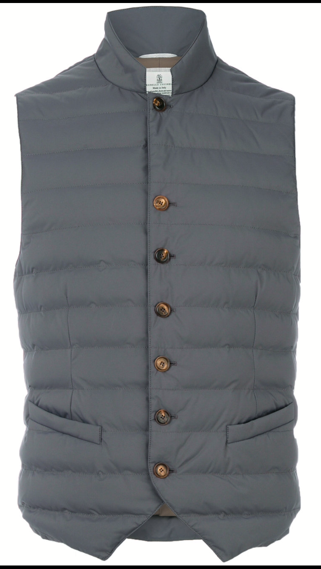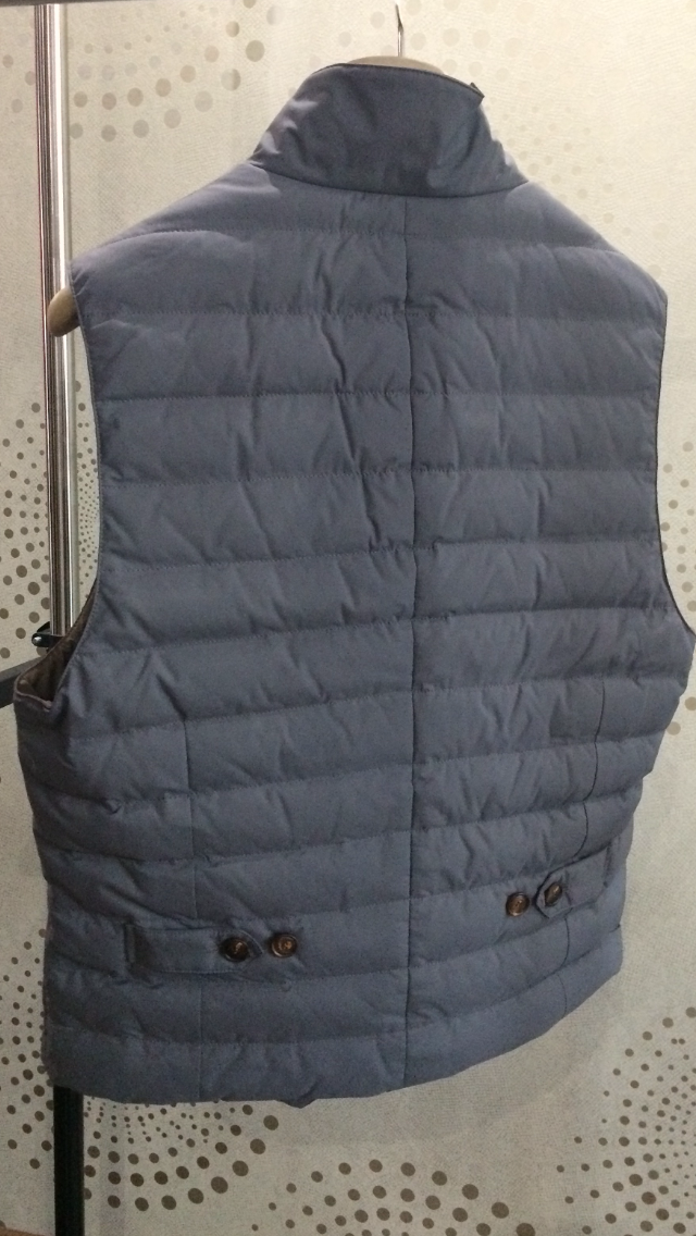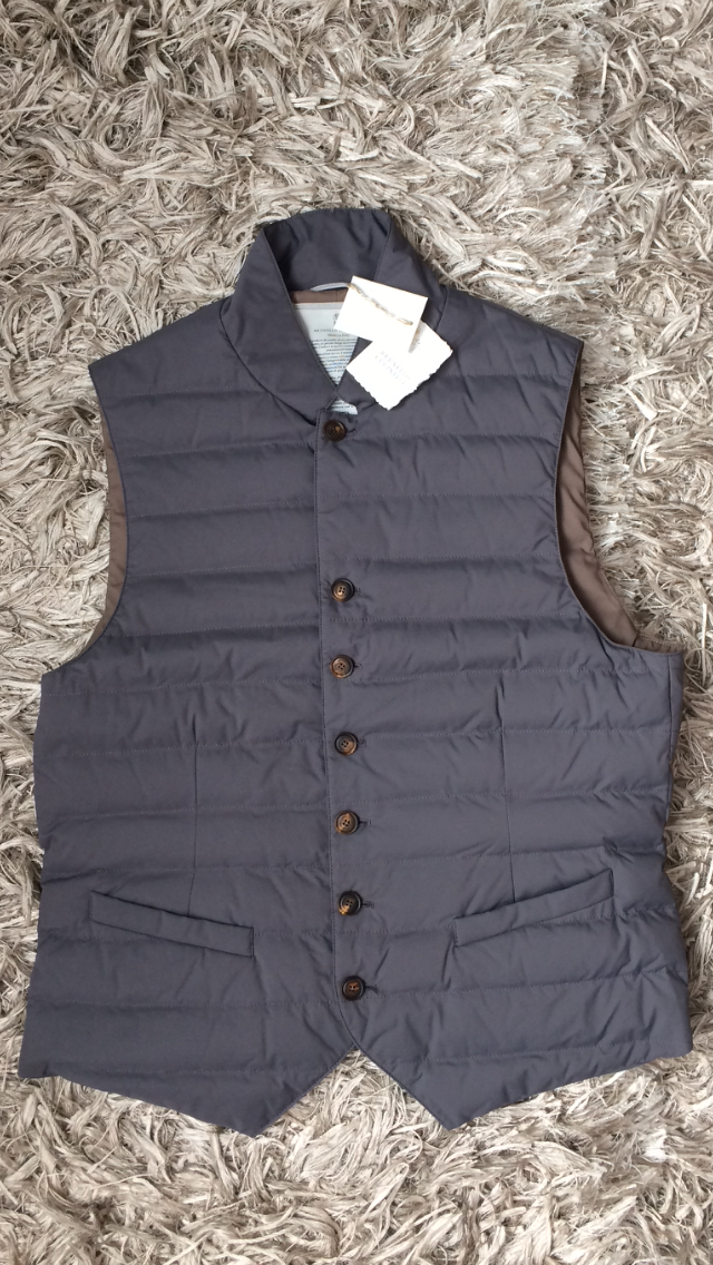 В продаже,новая лёгкая пуховая жилетка из водоотталкивающего матового нейлона с мембраной,от известной итальянской марки BRUNELLO CUCINELLI.Безрукавка выдержана в стиле классического жилета из очень современной ткани. Матовый водонепроницаемый нейлон с мембранной вставкой отличается невероятной легкостью. Специальная тонкая внутренняя мембрана обеспечивает комфорт и отличную защиту от дождя и влаги, одновременно позволяя ткани дышать. Легкая подкладка 20 грамм высококачественного гусиного пуха обеспечивает сбалансированную защиту от первой прохлады.Его можно также носить под пиджаками или трикотажными кардиганами для завершения образов в начале сезона.