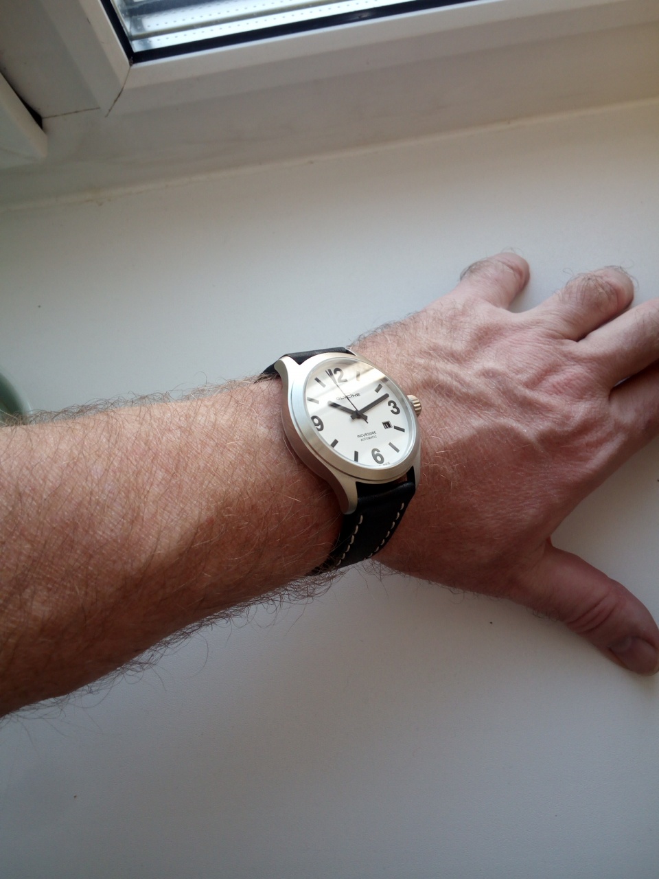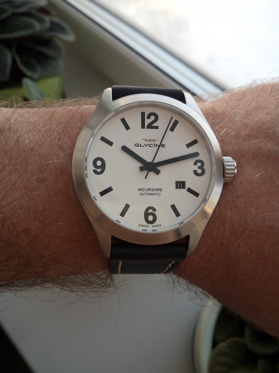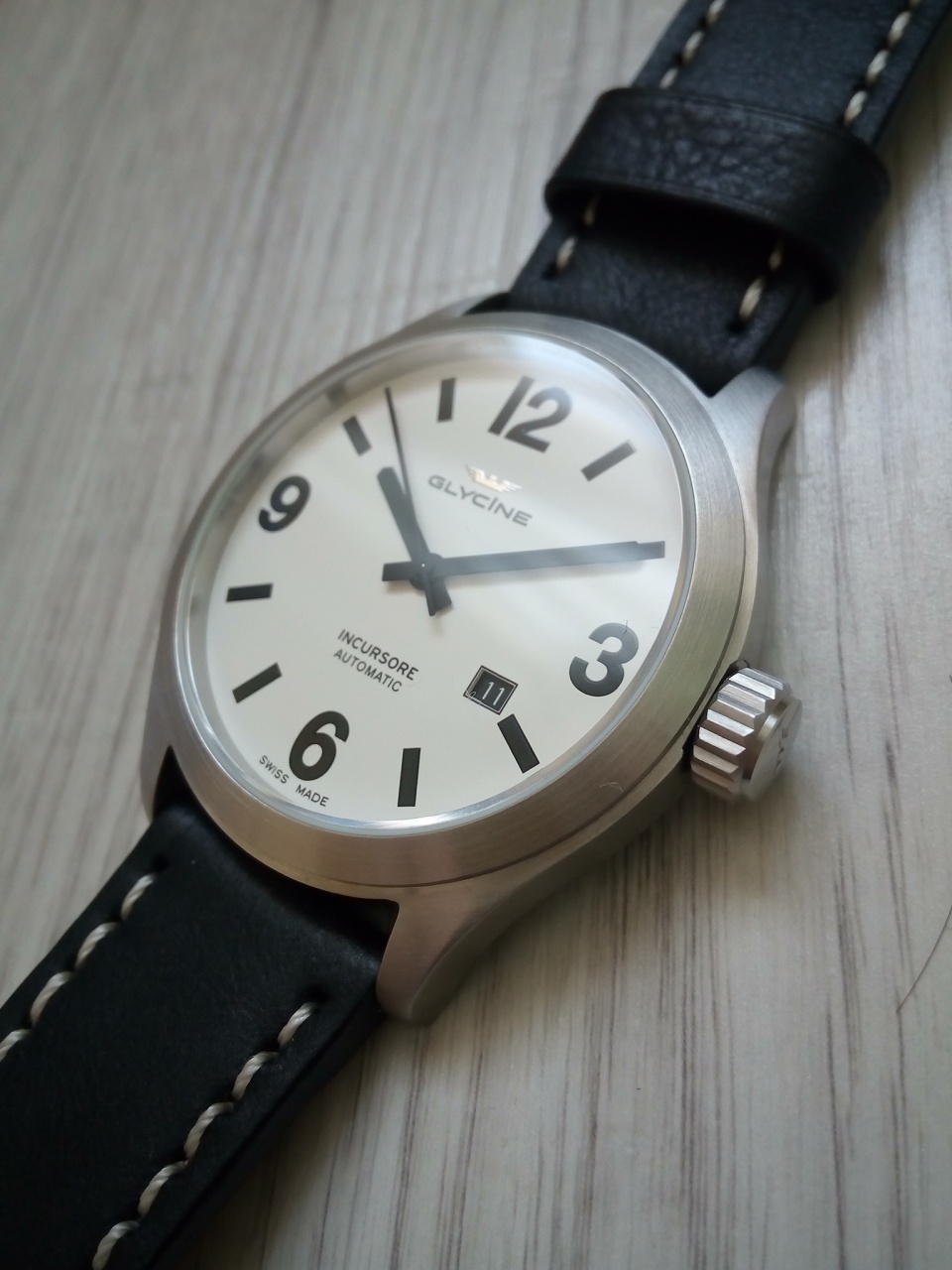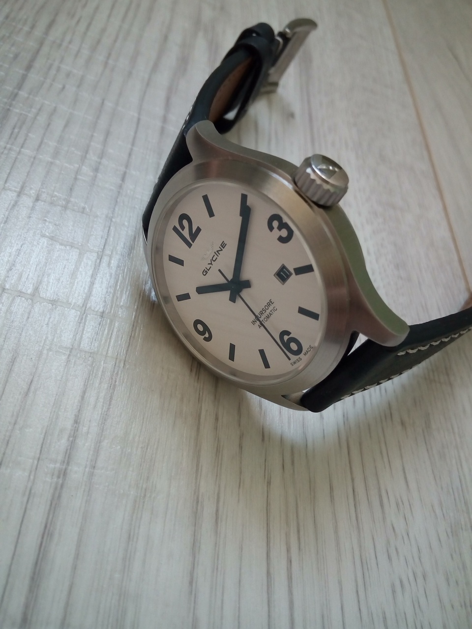 Циферблат: белый, скорее молочный, матовый с черными индексами с темно-зеленым люмом, который так же и на стрелках.