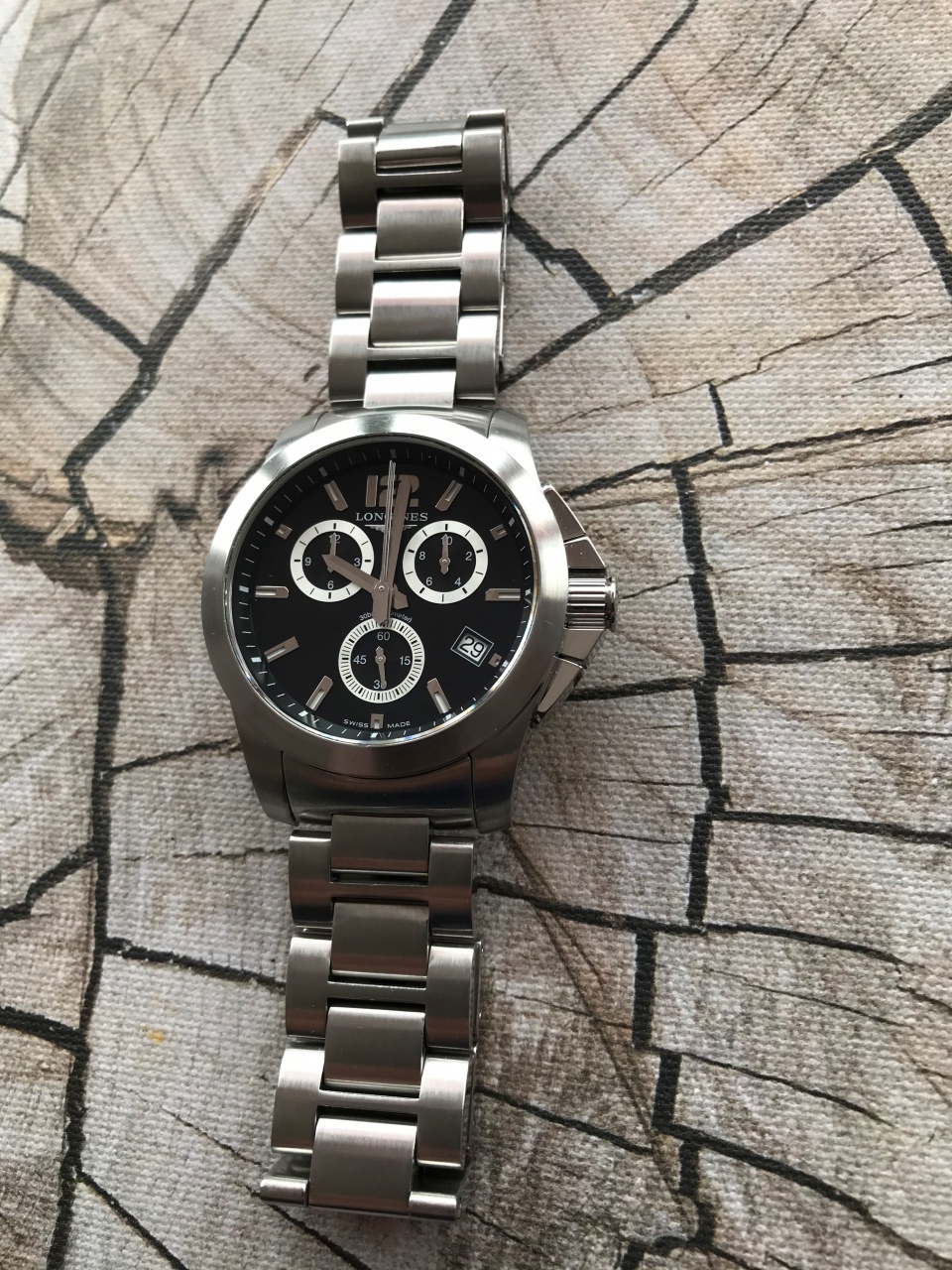В наличии популярный хронограф от Longines Conquest L3.660.4.56.6 в отличном состоянии! Производилось сатинирование безеля и центральных звеньев браслета, как по мне удачное и практичное решение! В комплекте: часы, внешняя коробка, шкатулка, доп. звенья. Стоит свежий элемент питания.