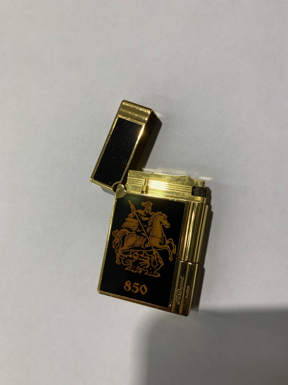 Компания S.T. Dupont решила отметить торжественную дату 850-летия основания столицы России и выпустила лимитированную серию зажигалок в 850 экземпляров, посвященную празднованию юбилея. Позолоченная зажигалка покрыта китайским лаком черного цвета. В его основе смола редкого растения Rhus Vernicifera, которую в небольших количествам собирают на берегах Красной реки в Китае и пересылают во Францию. Китайский лак стал фирменным материалом для покрытия изделий S.T. Dupont, а секрет его обработки строго сохраняется. На одну из сторон зажигалки лаком золотого цвета нанесено изображение Георгия Победоносца, ставшего символом Москвы.