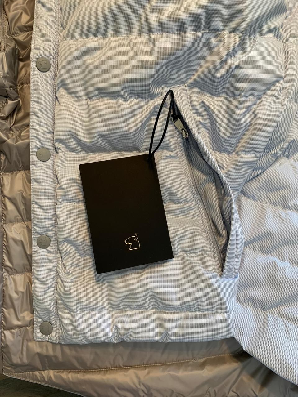 Продается новый мужской пуховик на переходный период бренда MONTECORE превосходного исполнения, стеганый узор, логотип, пастельно-голубого цвета, классический воротник, однобортная модель, кнопки, множество карманов, два нагрудный кармашка на кнопках, боковые прорезные карманы на молнии, манжеты рукавов на кнопках, два внутренних кармана: один на молнии, другой на пуговице, внутри на гусином пуху, длина 72 см, состав: 100% полиамид, все бирки и запасная фурнитура прилагаются, гарантированный оригинал, размер 52(IT), страна бренда Италия.