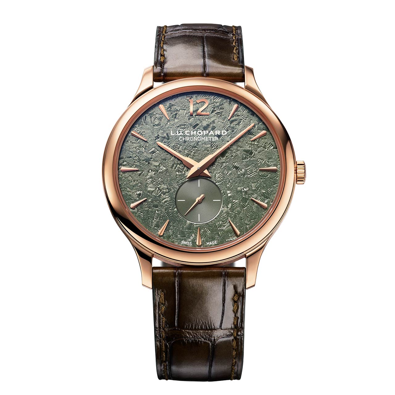 Корпус новинки круглый полированный, изготовленный из розового золота Fairmined, диаметром 40,0 мм, толщиной 7,2 мм, водонепроницаемый до 30 метров. На торце рифленой заводной головки, расположенной на 3 часах, выгравирован логотип мануфактуры L.U.C. Сапфировое стекло установлено на передней стороне часового корпуса (с антибликовым покрытием) и на его завинчивающейся задней крышке. Зеленый циферблат с отделкой в виде листьев, с золотыми накладными арабскими цифрами, продолговатыми часовыми индексами на его периферии, а также с золотыми гранеными стрелками Dauphine.
