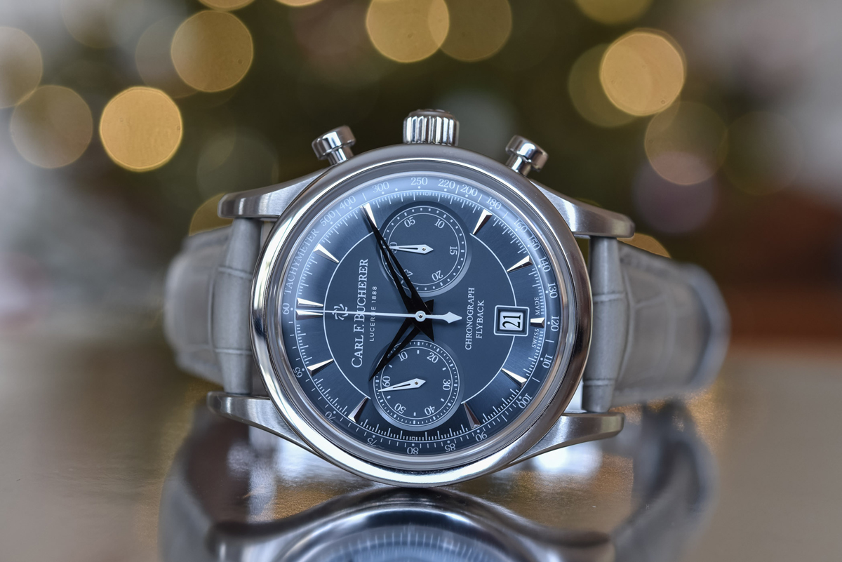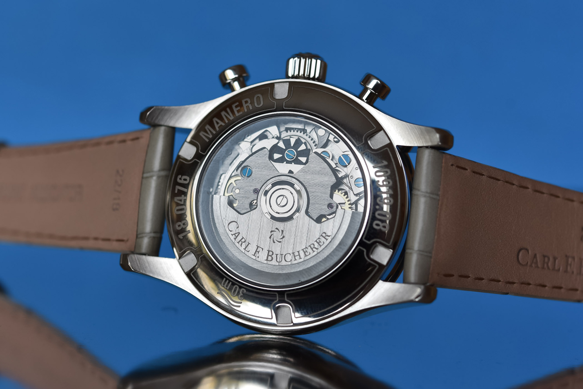 Carl F. Bucherer Manero Flyback предлагаются на сером ремне из кожи аллигатора, оснащенным клипсой с кнопочными фиксаторами. Стоимость модели составляет 5 900 швейцарских франков.