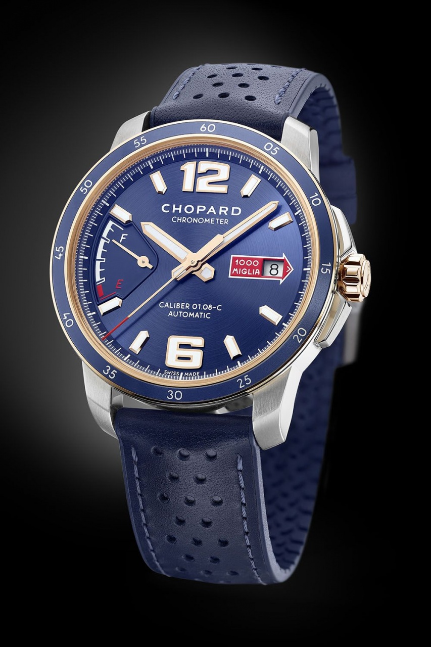 Биколорная модель Chopard Mille Miglia GTS Azzurro Power Control сочетает сталь (корпус) и розовое золото (заводная головка, безель, стрелки и цифры с индексами). Размеры корпуса – 43 х 11,43 мм. Безель оснащен синей алюминиевой вставкой с минутной шкалой. Работу часов обеспечивает сертифицированный COSC автоматический калибр 01.08-C с 60-часовым запасом хода. Ремешок такой же, как и у хронографа. В рамках серии заявлено 500 экземпляров. Ориентировочная стоимость модели составляет € 9640.