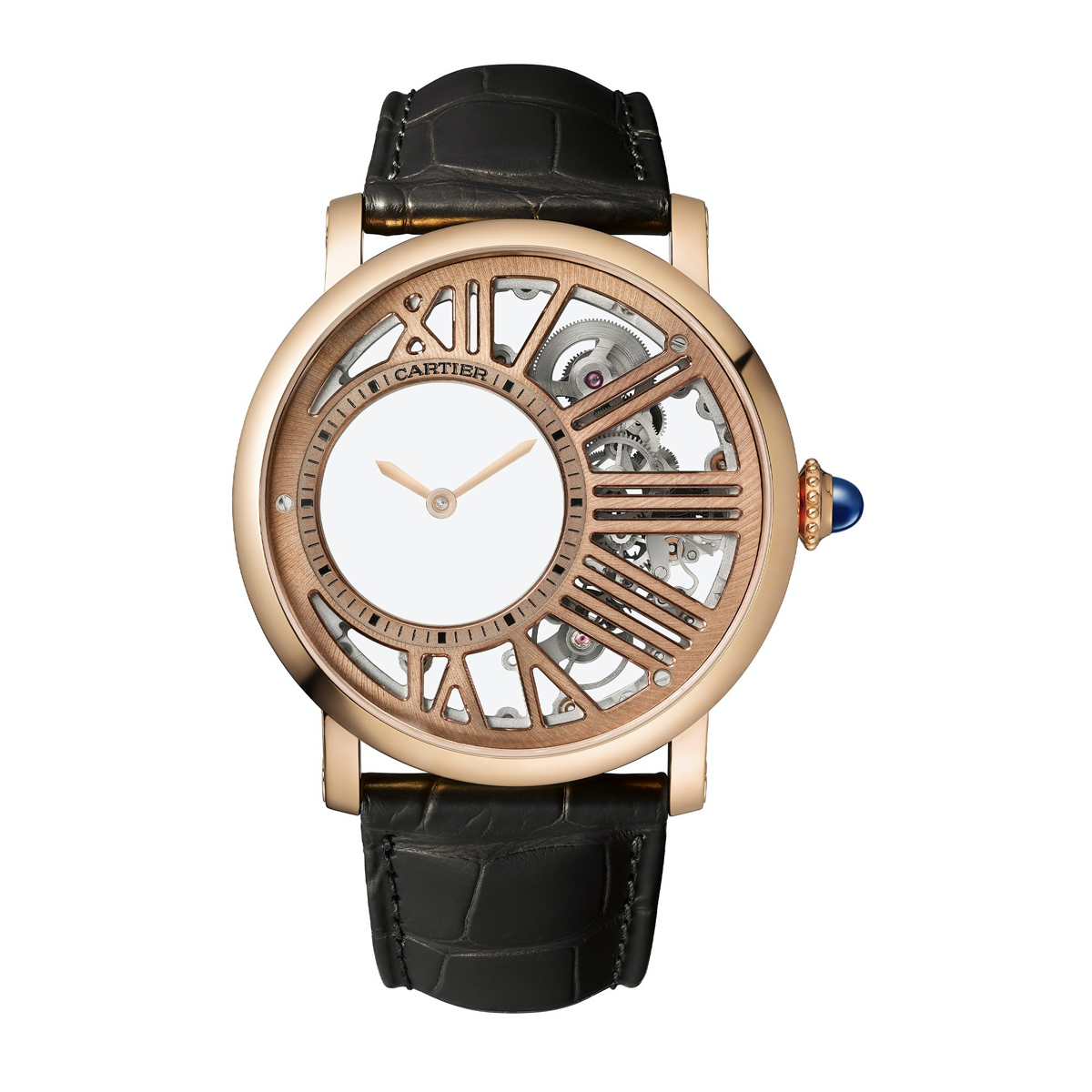 Rotonde de Cartier Mystery Skeleton – часы с «левитирующими» стрелками. Корпус диаметром 42 мм заключает в себя скелетонизированный циферблат и механизм, вращающий сапфировые диски с минутной и часовой стрелками. Практически все детали механизма смещены вправо к заводной головке и хорошо просматриваются сквозь часовые индексы. Корпус часов, циферблат и заводная головка, увенчанная сапфировым кабошоном, выполнены из розового золота 750 пробы.