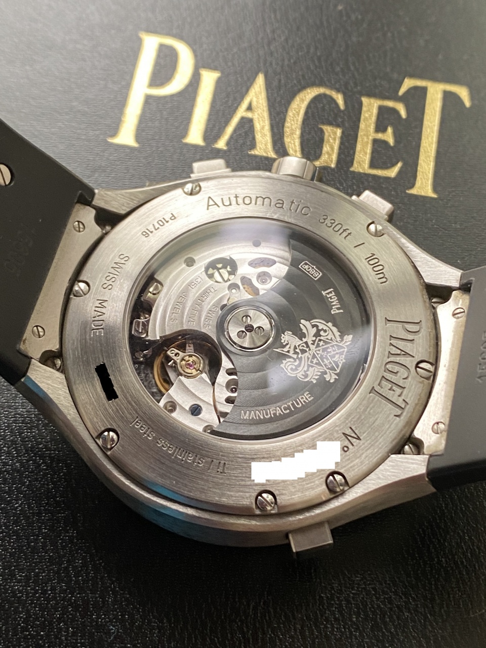 Отделка механизма - Вороненые винты, круговой узор Côtes de Genève, платина с жемчужным зернением, мосты со скошенными углами, ротор с выгравированным гербом Piaget.