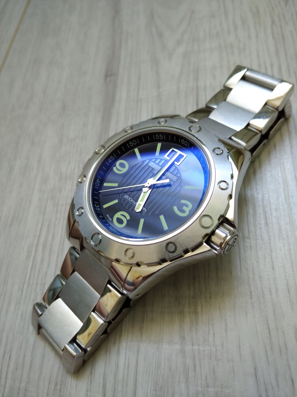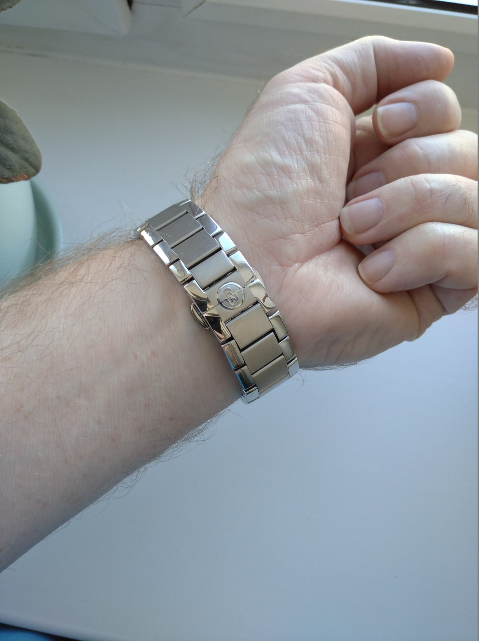 Браслет: сталь 22мм сатин плюс полировка, на 19,5 см максимум с раскладывающейся застежкой с двумя кнопками. Ремни менять очень легко, ибо ухи просверлены.