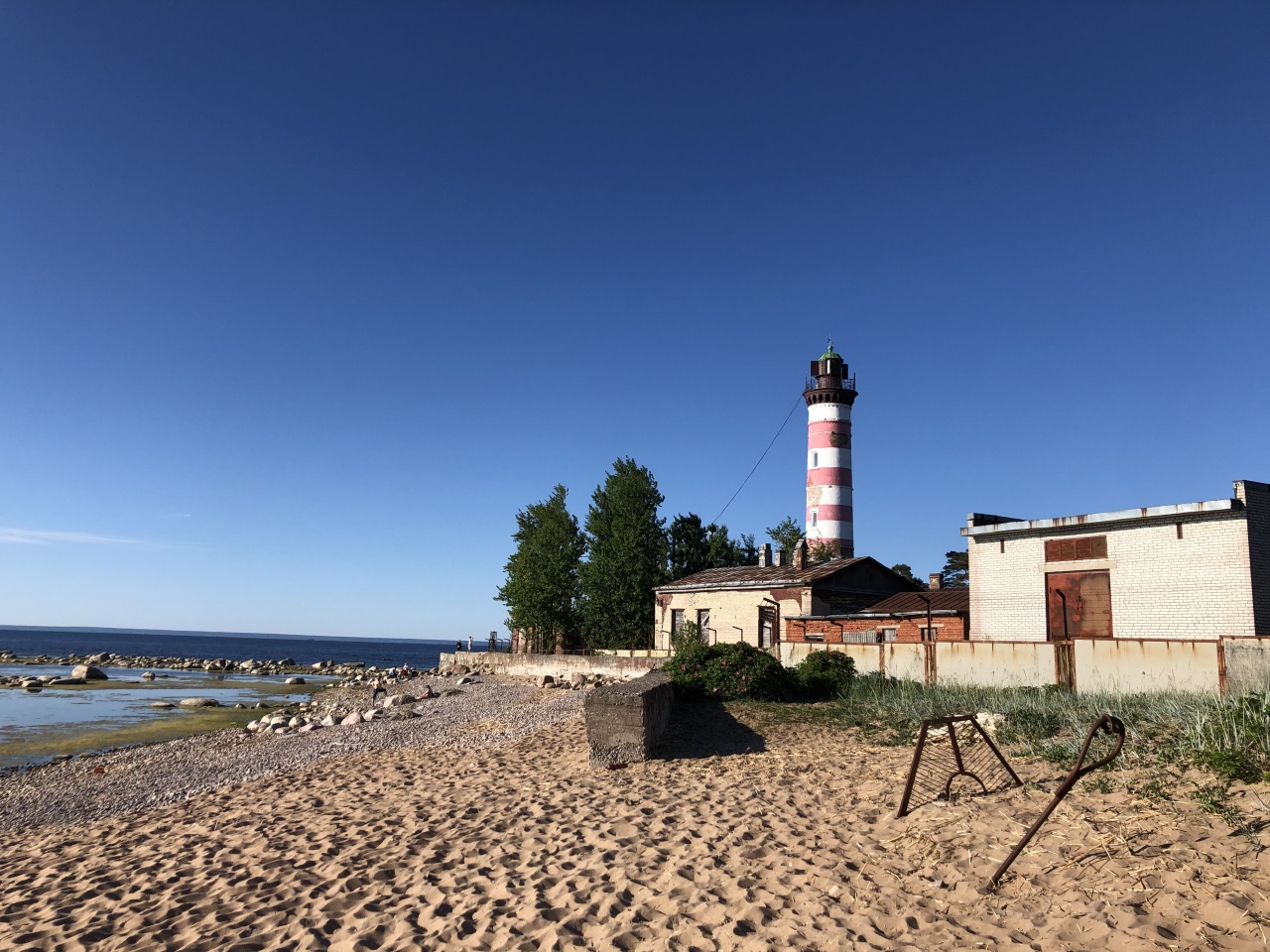 Шепелевский маяк расположен на берегу финского залива в окружении леса и каменно-песчаных пляжей. Конечно, это не маяк на обрыве скалы, здесь не бушуют штормы и даже прибоя практически нет. Так еле еле плещется залив, а из-за стоячей воды запах моря немного отдаёт болотом.