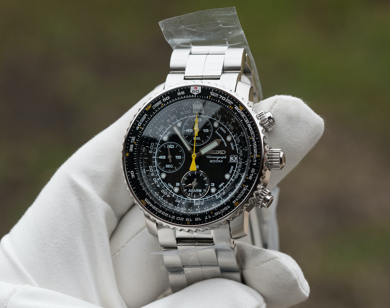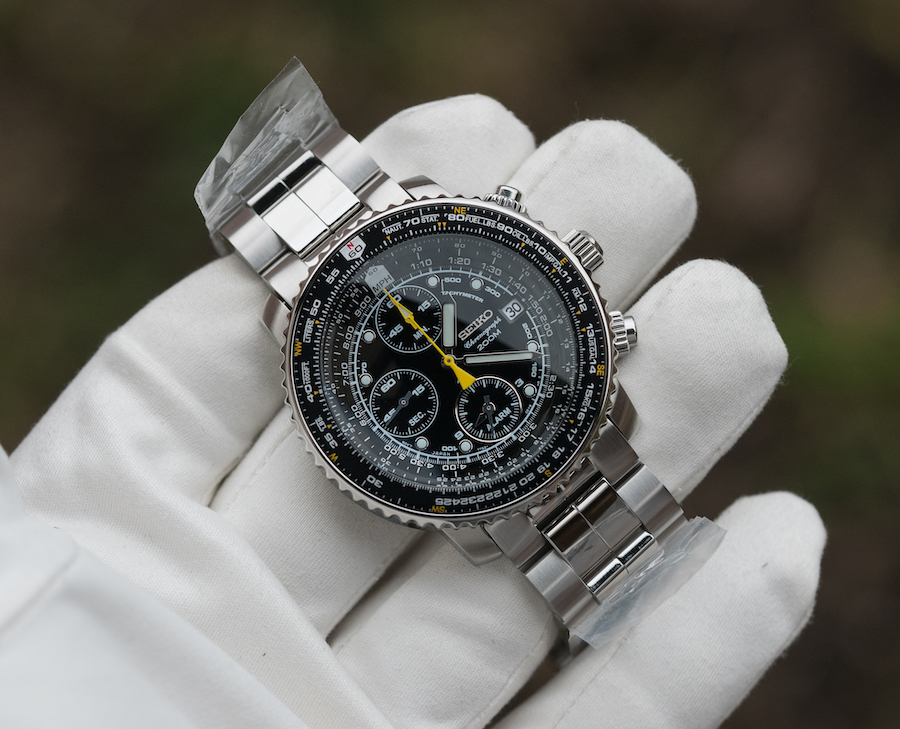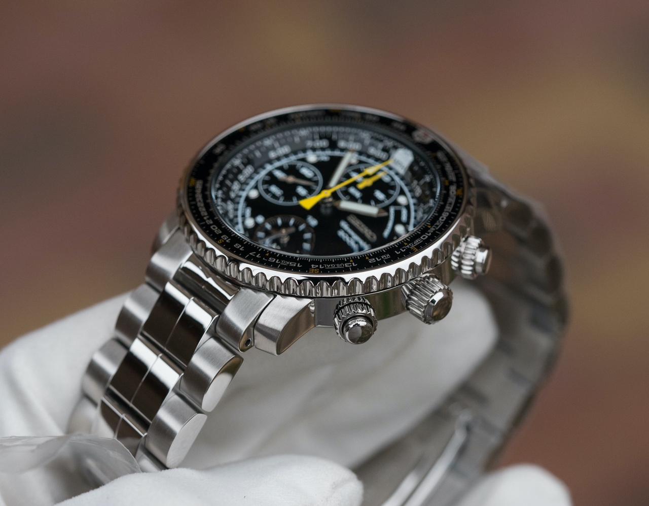 Черный глянцевый циферблат, накладные метки и лого Seiko
