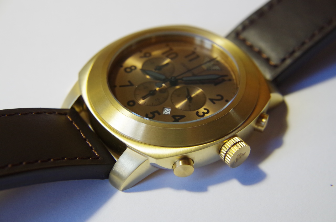 Корпус часов диаметром целых 46мм, с головкой 51,5мм, изготовлен из нержавеющей стали с покрытием жёлтого цвета. Обработка корпуса на всех плоскостях - мелкое сатинирование. Плавные линии нижней части корпуса полированы. Верхняя площадка корпуса радиально сатинирована. Безель очень широкий, классический, имеет невысокий угол подъема, сатинирован по длине окружности.