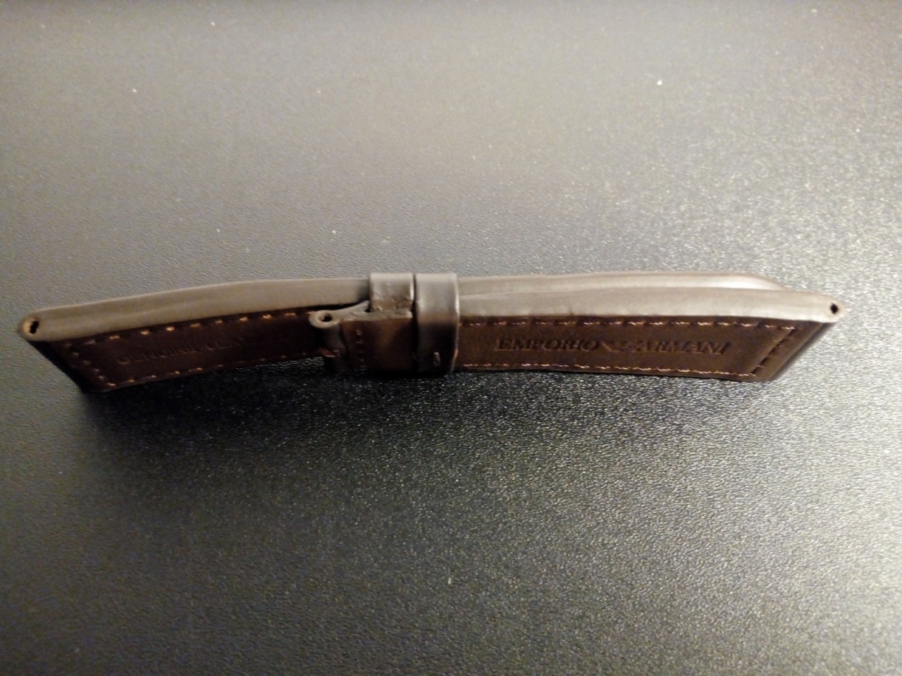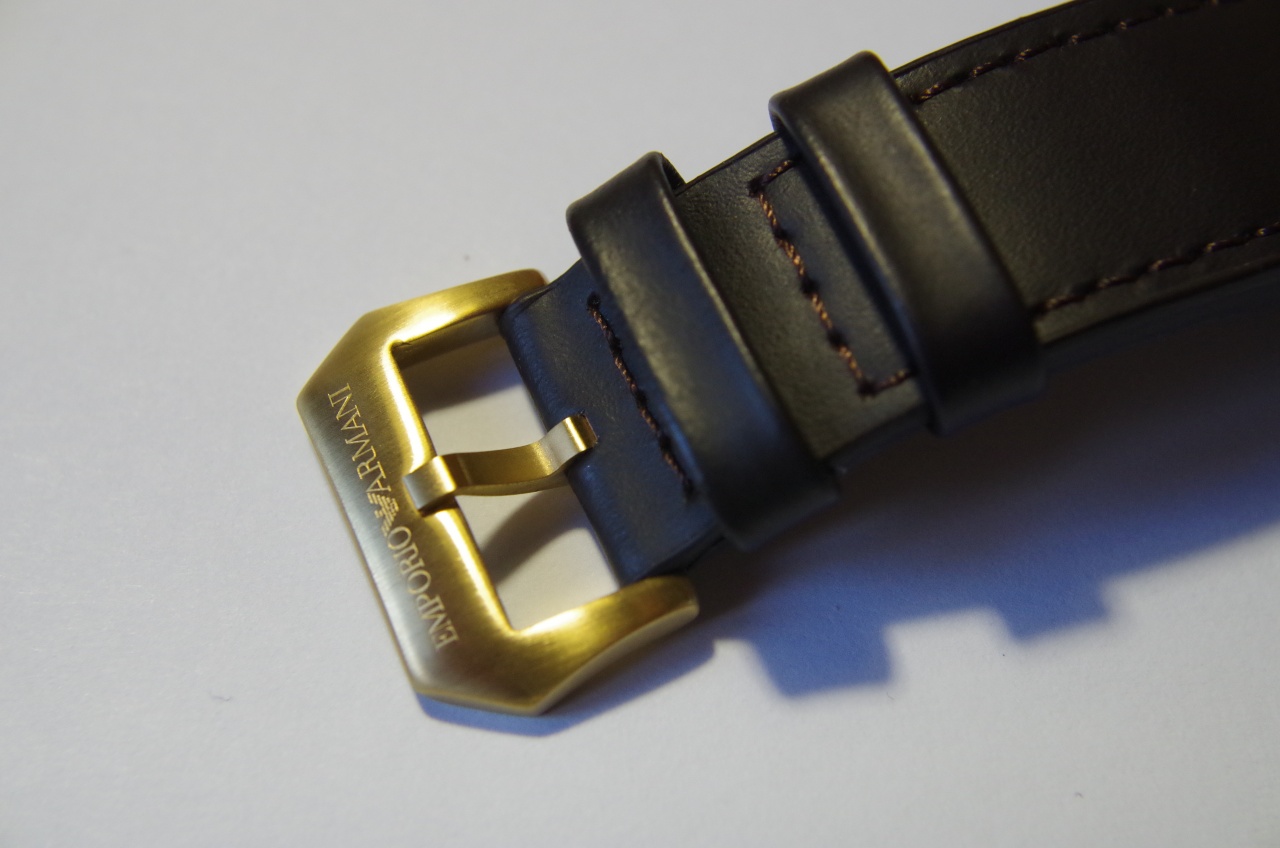 Бакля памообразная, литая, с покрытием как у корпуса, сатинирована. Есть неглубоко гравированная надпись Emporio Armani. Бакля не плоская, немного выгнута, должно быть для комфортной посадки.