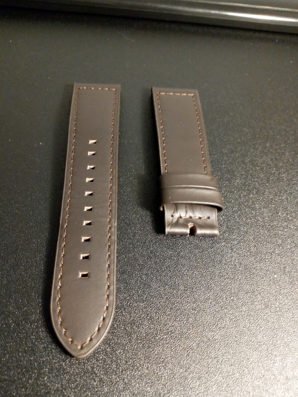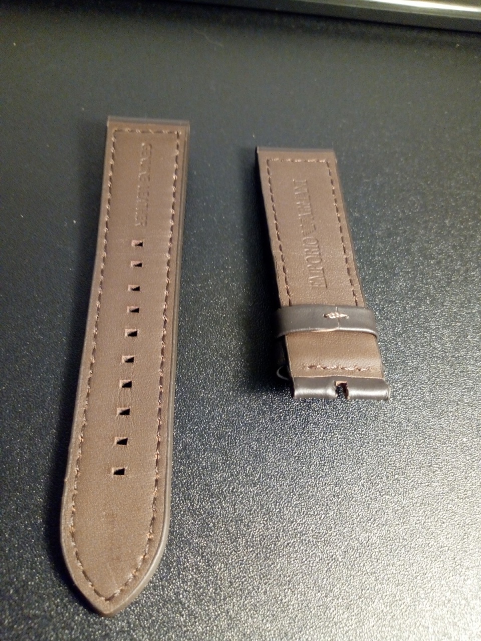 Ремешок кожаный, похоже двухслойный, довольно жесткий, сгибается с трудом. Имее запах недорогих ботинок, прострочен коричневыми нитками.