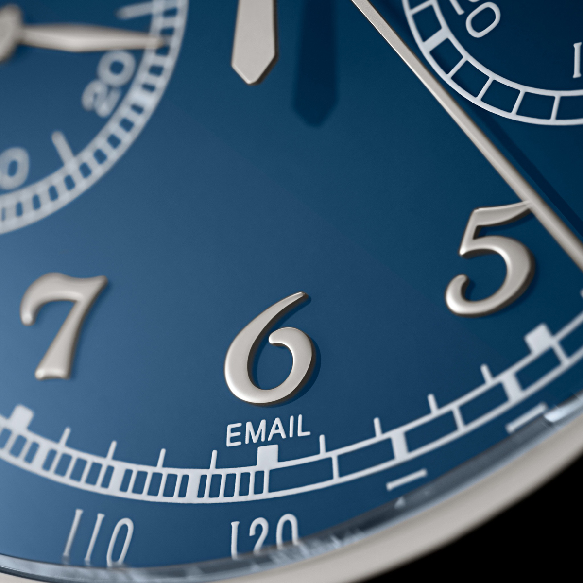 5370P Split-Seconds, впервые представленного в 2015 году. Обновление затронуло только эмалевый циферблат - теперь он синего цвета, по-прежнему выполненный в технике Grand Feu. Накладные цифры в стиле Breguet из белого золота, разметка элементов хронографа, выполненная методом аппликации также из белого золота, листьевидные часовая и минутная золотые стрелки с люминесцентными вставками завершают образ элегантного циферблата с отличной читаемостью. У отметки 6 часов расположена надпись EMAIL, но пусть это не пугает поклонников компании, Patek не претендует на рынок смарт-моделей и часы не синхронизируются с электронной почтой владельца, надпись указывает на технику исполнения циферблата – EMAIL по-французски «эмаль».