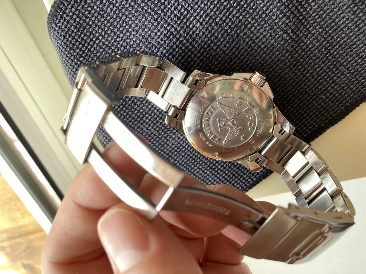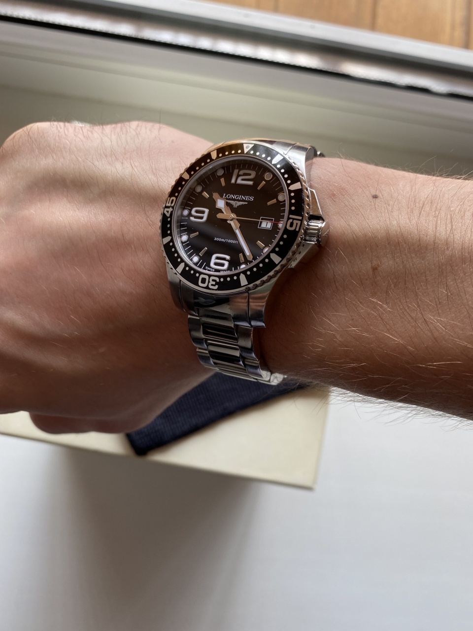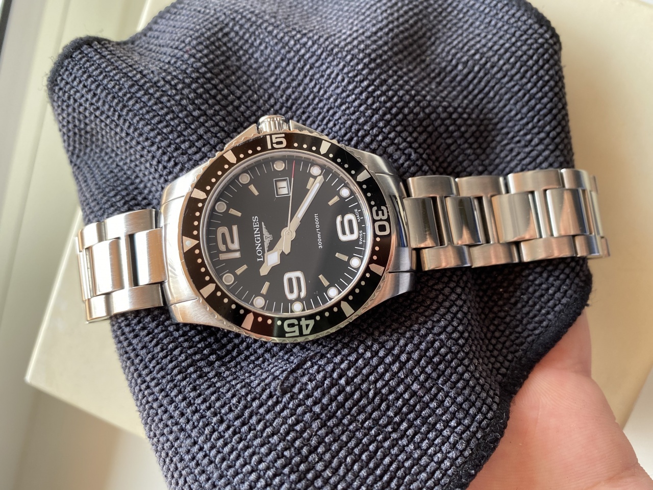 Longines HydroConquest L3.640.4.56.6 в универсальном размере 39 мм с черным циферблатом. Состояние отличное, естественные следы носки - не более того, стекло в идеале. Полный комплект - коробка, книжка, карточка, звенья для браслета все имеются. Часы, судя по гарантийной карточке, покинули магазин в октябре 14 года. Мною куплены у человека в 18 году, как неношеные. Соответсвенно, можно считать, что владелец один. Перед продажей заменил батарейку (разумеется, Renata) и промазал силиконом резинки.