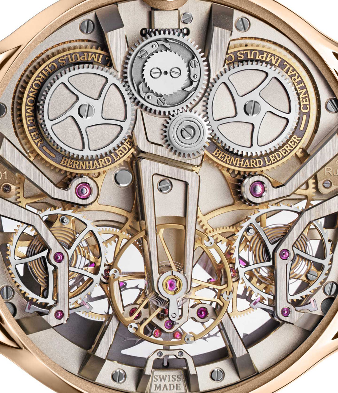 В основе механизма caliber 9012, разработанного и изготовленного Бернхардом Ледерером, лежит система центрального импульсного спуска. Этот особый тип спуска уходит от принципа классического анкерного спуска и позволяет более непосредственно соединять анкерные колеса с балансовым колесом. В сочетании с другими, более классическими элементами механизма, система позволяет обеспечить максимально достижимую на сегодняшний день точность механических часов (хотя, как и у большинства подобных сверхсложных механизмов, фактический уровень точности внутри диапазона сертифицированного хронометра производителем не раскрывается). В механизме caliber 9012 применяются две подобные системы импульсного спуска, каждая из которых дополнительно оснащена системой постоянного усилия, ремонтуаром с волосковой спиралью, который накапливает и передает балансовому колесу дискретные импульсы равного значения, доводя амплитуду и равномерность колебания балансового колеса до максимально возможных показателей. Еще одной интересной особенностью caliber 9012 является наличие у каждой системы импульсного спуска своей независимой колесной передачи, регулирующихся одним балансовым колесом. Подобная компоновка механизмов встречается и в других часах, но принцип их работы основывается на усреднении результатов хода с помощью дифференциала. Однако в механизме Central Impulse Chronometer дифференциал отсутствует, одна колесная передача отвечает за ход боковой секундной стрелки, а вторая приводит в движение часовую и минутную стрелки. Этот подход сам по себе не новаторский, но редкий и интересный по своему исполнению. Архитектура механизма, состоящего из 208 деталей и работающего на частоте 3 Гц (21 600 пкч), поражает своей технической красотой. Эстетика довольно современная, но при этом используются только традиционные методы декора и изготовления. Caliber 9012 очень энергоемкий механизм, два пружинных барабана, заводящихся вручную, обеспечивают всего лишь 38 часов автономности – результат применения двух колесных передач.
