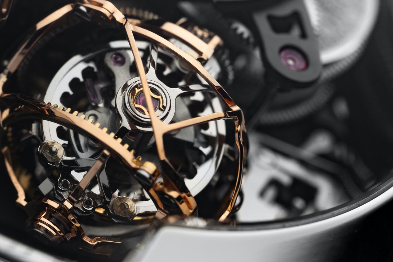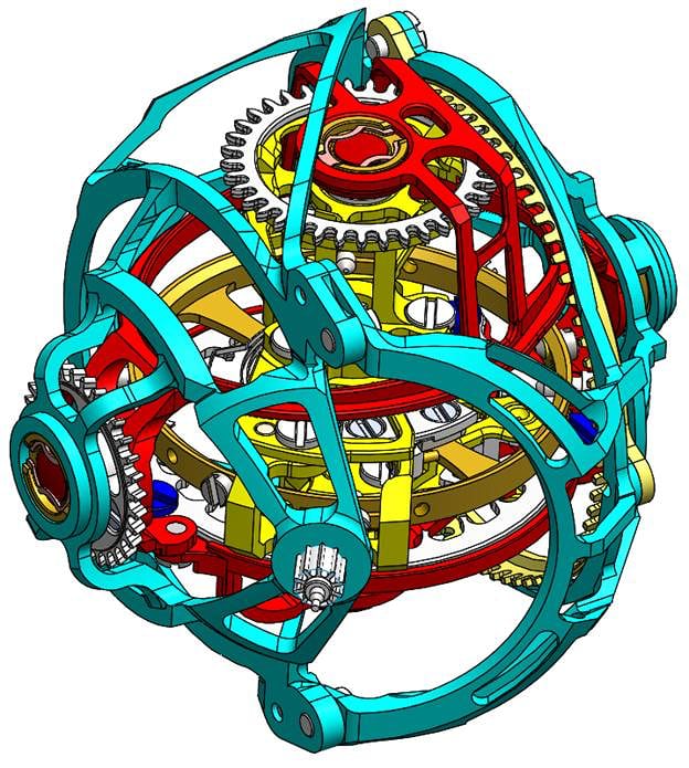 Самая большая проблема с любым турбийоном заключается в том, что его механизм по сути является энергетическим паразитом. В классическом механизме четвертое колесо колесной системы напрямую приводит в движение анкерное колесо, которое затем передает энергию через анкерную вилку на балансовое колесо. Потери энергии происходят во всей колесной системе из-за трения (их можно уменьшить, но никогда не устранить полностью), а также в самом спусковом механизме из-за трения скольжения на паллетах анкерной вилки и ее геометрии. В турбийоне проблема усугубляется тем, что колесная система должна приводить в движение не только анкерное и балансовое колеса, но и саму каретку турбийона, справляясь при этом с её инерцией, и вся сложная конструкция должна запускаться из неподвижного положения каждый раз, когда анкерная вилка разблокирует анкерное колесо. По этой причине исторически сложилось так, что даже обычный турбийон должен быть сконструирован и изготовлен с очень высокой степенью точности, а каретка всегда делалась как можно легче, чтобы уменьшить нагрузку на колесную систему. В конструкции трехосного турбийона все проблемные моменты с потерей энергии усиливаются многократно, особенно учитывая высокую скорость вращения кареток. По этой причине титан является широко используемым материалом в конструкции, а зазоры между каретками минимальны - от 0,1 до 0,2 мм - и весь турбийон Spherion весит всего 0,79562 грамма. В каждом Spherion используется восемь противоударных систем Incabloc - по две на каждую из трех кареток, плюс еще две для балансового колеса.
