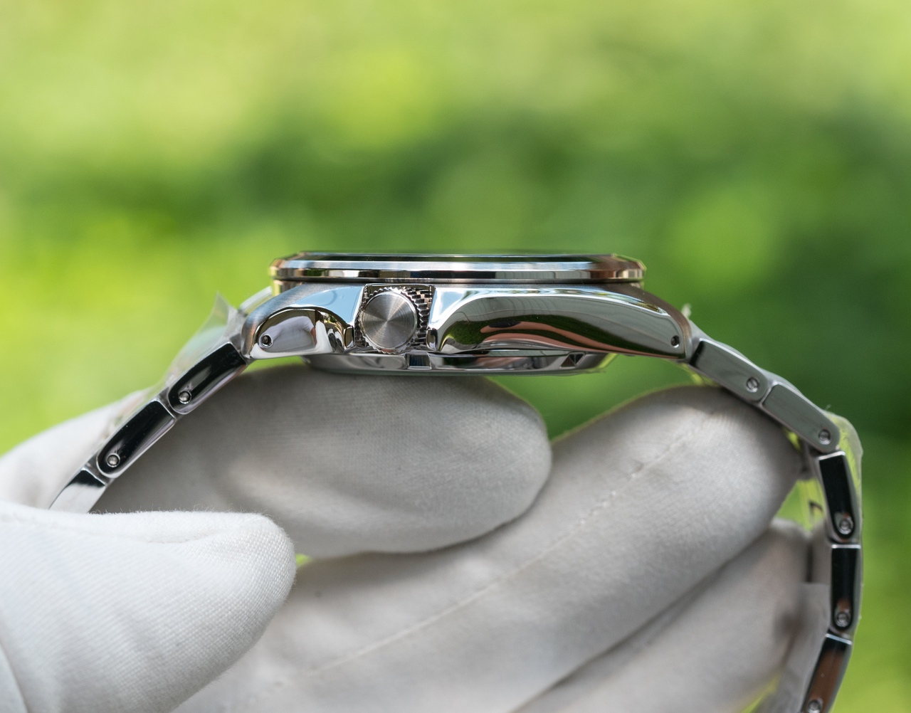 Стальной корпус, сатин + полировка, защитные наплывы у заводной головки