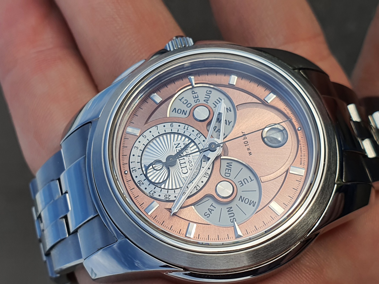 Красивые Citizen с солнечной батареей Eco-Drive с годовым календарем и фазой луны, с красивым "лососевым" циферблатом, на браслете и на полном комплекте.