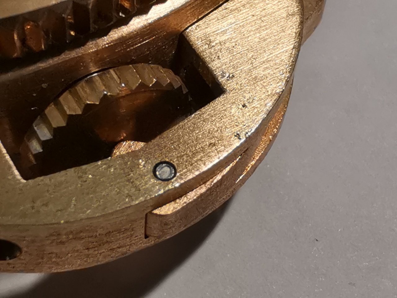 Безель единометаллический, средне сатинированный по длине окружности. Безель на 120 щелчков, вращается с нормальным усилием против часовой стрелки. Жемчужина встаёт почти (но не ровно) на 12 часов. На поле безеля имеются отметки соответствующие 5 минутам, выполненные в виде металлических столбиков со сферическим верхом, вставленных в соответствующие отвертия. На моём экземпляре метка с числом 15 установлена криво и не в плоскости, так, что видна небольшая щель между дном столбика и отвертием под него.Также, криво, почти боком установлен столбик-метка у цифры 30, там щель и вовсе в глаза бросается. Безель установлен не плотно к корпусу часов, так, что при нажатии на край безеля, видимый зазор между корпусом с противоположной стороны увеличивается, при этом слышится легкий хруст(пощелкивание). Заводная головка достаточно плоская, работоспособная, и достаточно удобная, благодаря посадке на втулку-шейку, которая отводит головку от корпуса. К работе головки претензий нет. Защитная скоба над головкой выполнена с тем же типом сатинирования, что и корпус. Имеются неудаленные следы литья в виде рытвин и ямок, которые вроде пытались затирать шкуркой, но потом решили, - и так сойдёт. Рычаг прижимающий головку работает уверенно, хотя в отличие от Сан Мартина не имеет колесика, выполнен бюджетно. На корпусе имеется гелиевый автоматический клапан, но в его необходимости я смею сомневаться, так как подозреваю, что эта модель часов не способна выдержать те нагрузки, о которых она демонстративно заявляет, а именно 50 атмосфер. Задняя крышка из нержавеющей стали, имеющая выемки для ключа, закручена криво или не до конца, в одном месте она плотно прилегает к корпусу, в другом, видна щель достаточная для проникновения воды. Крышка приподнятая в центральной части имеет крупное сатинирование по длине окружности. В центре располагается гравированный логотип бренда в иде скрещенных ласт маски и баллонов. Вокруг логотипа надпись информирующая о бренде, водозащите и установленном механизме Seiko NH35.