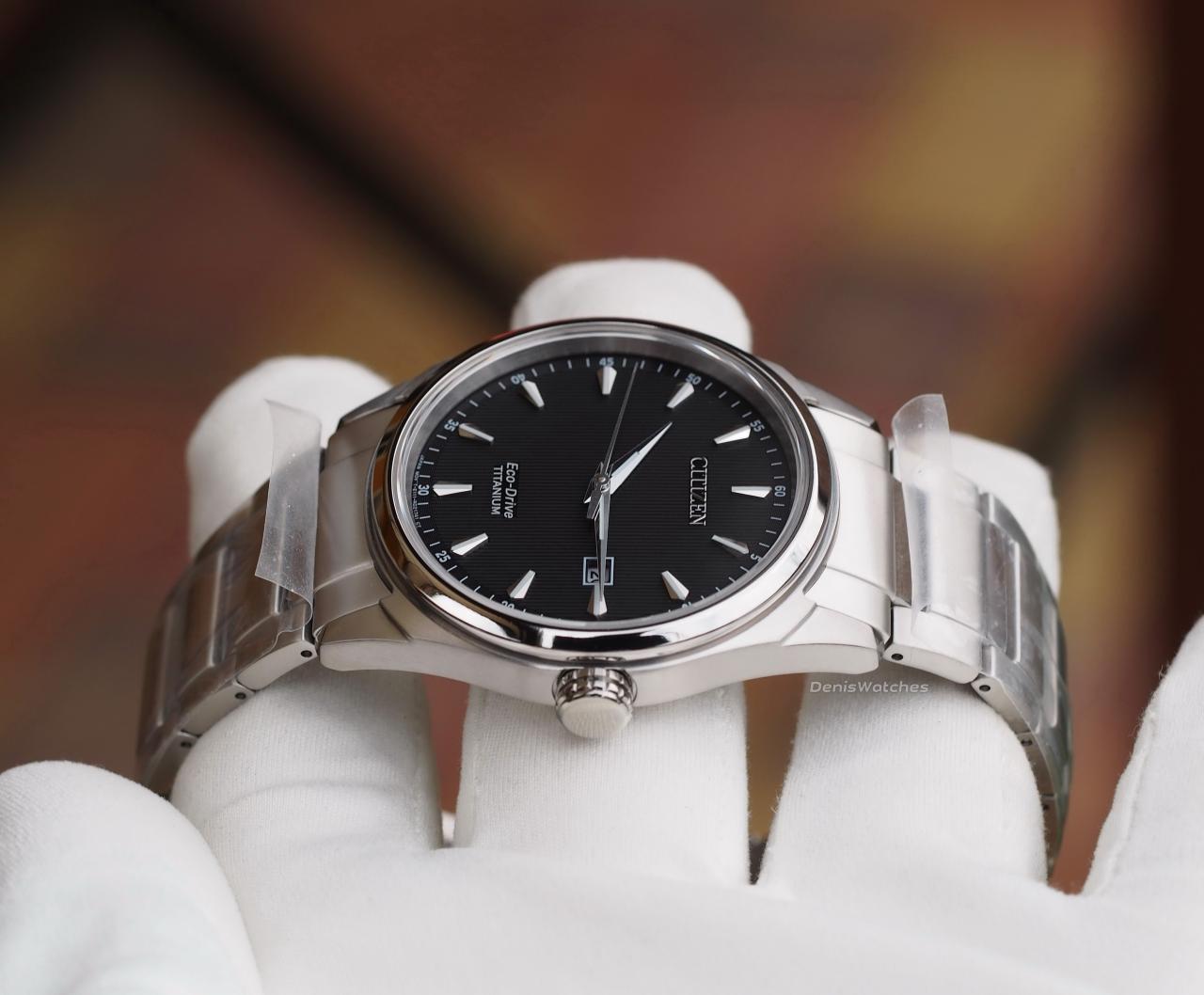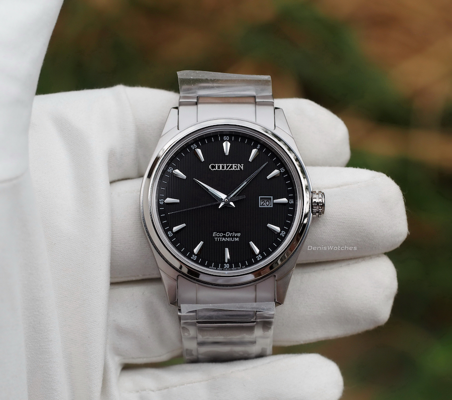 Титановый трехстрелочник с зарядкой от света, черный циферблат в мелкую вертикальную полоску, спокойный универсальный дизайн, очень напоминают известную Omega Aqua Terra