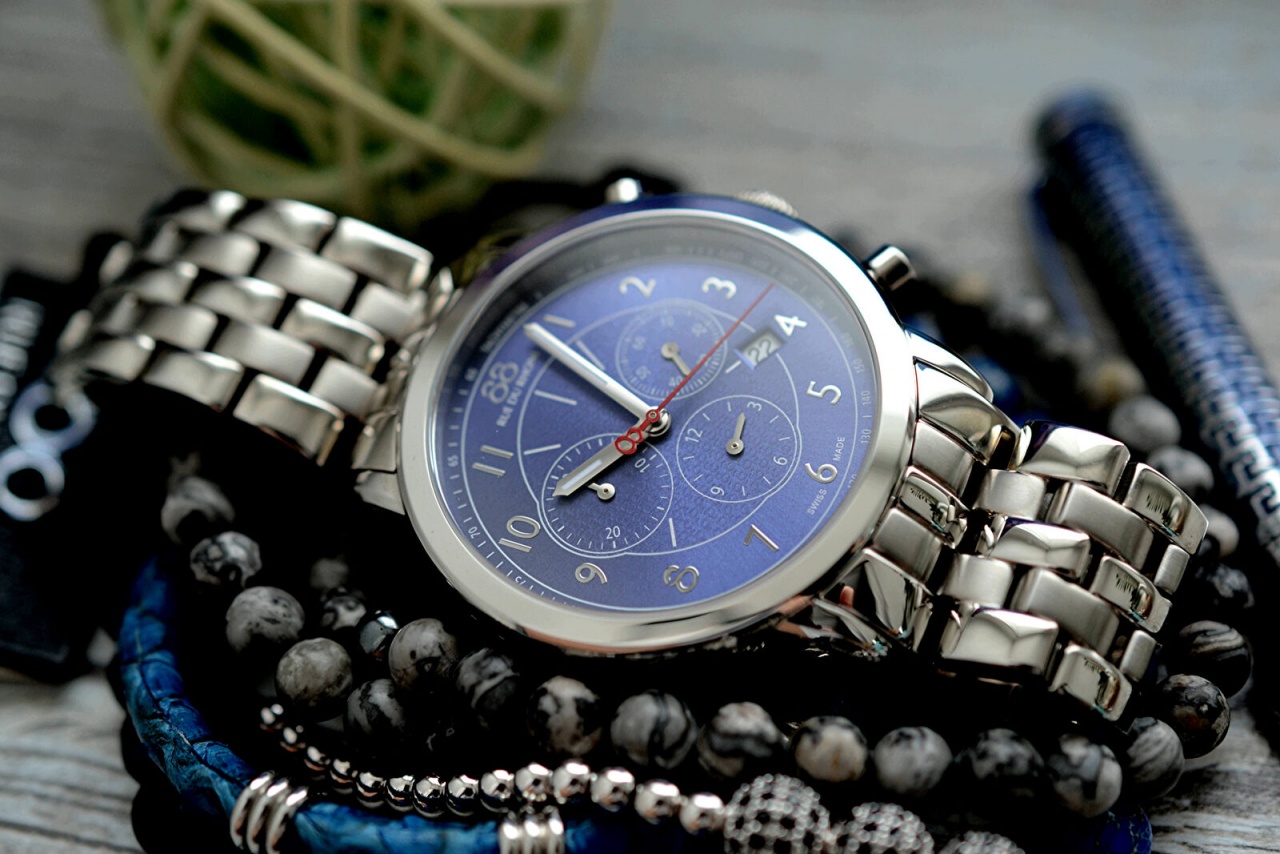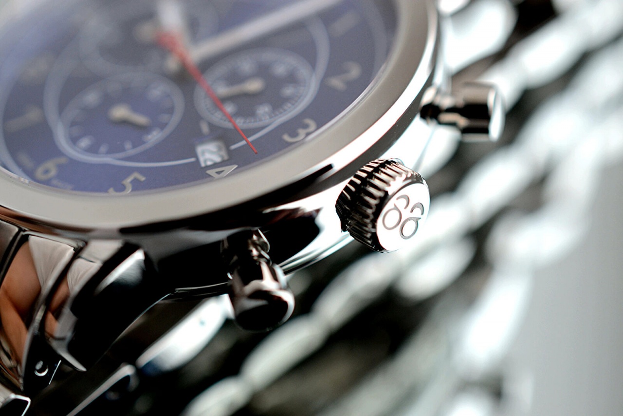 На циферблате расположены счетчики минут, секунд и часов хронографа, маленькая секунда и указатель даты.