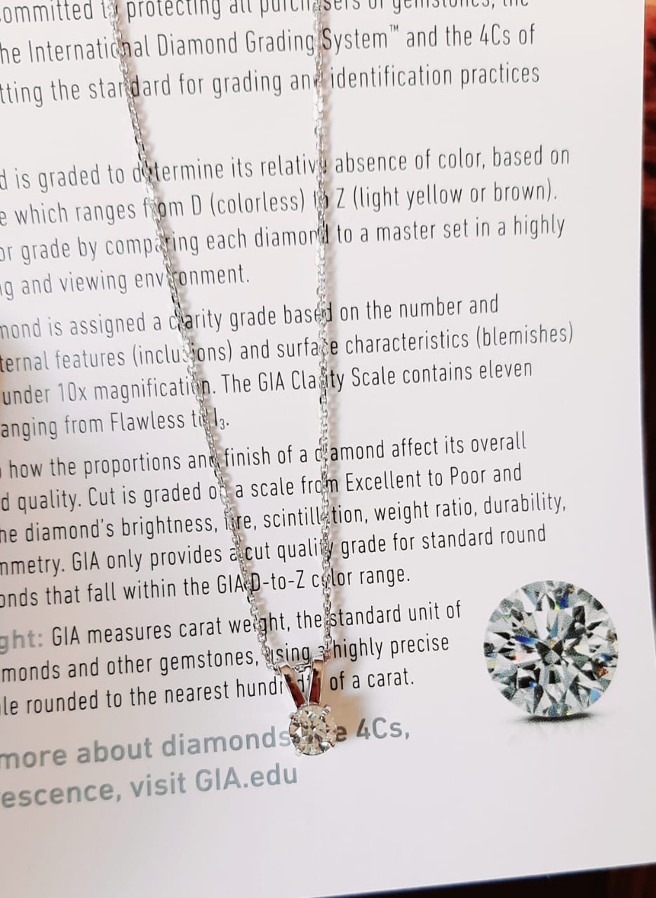 В продаже кулон с бриллиантом 0,43 карата triple excellent - H/SI1, сертификат GIA. Благодаря диаметру, камень смотрится как 0,50 карат!