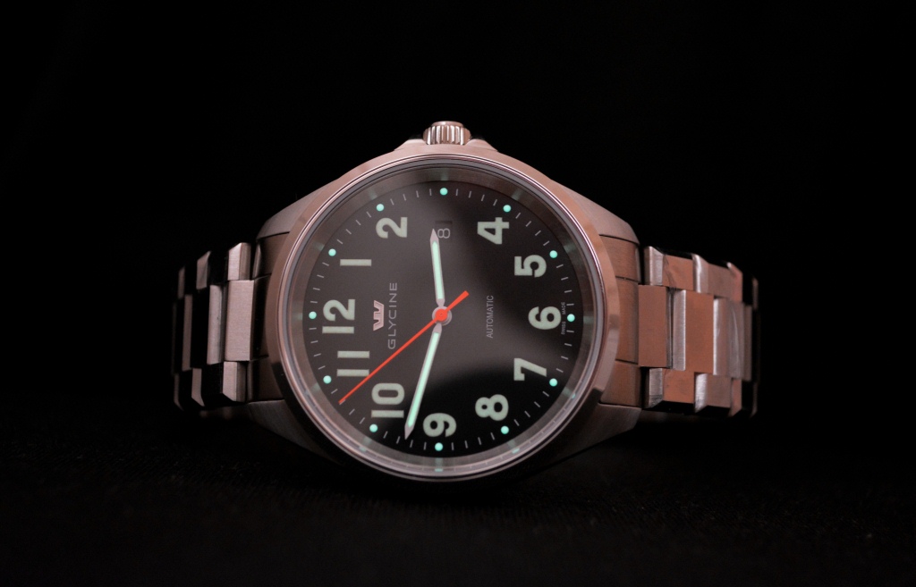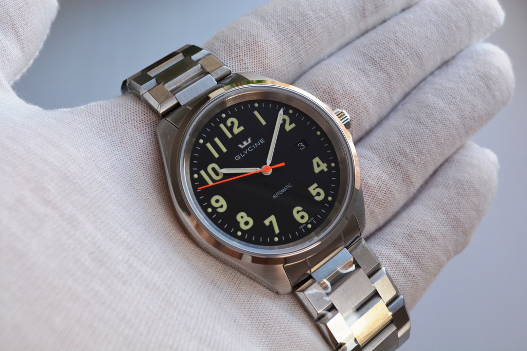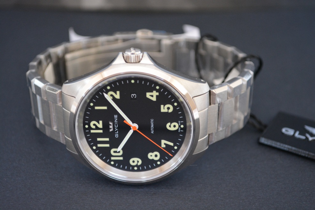 Чёрный матовый циферблат с арабскими цифрами. Окошко даты в положении 3 часа