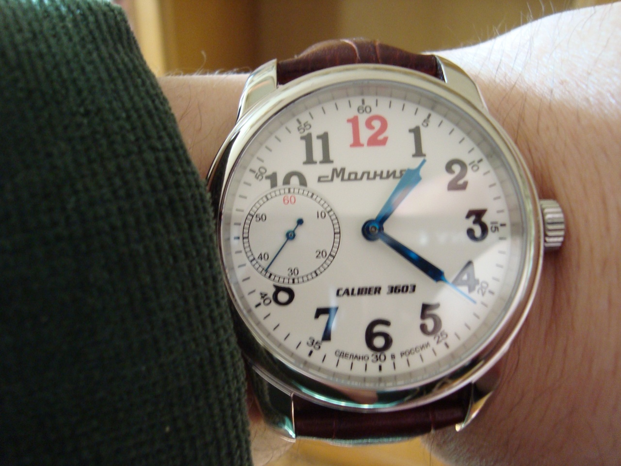 Первое, что бросилось в глаза это упаковка. Добротная кожаная коробочка с кожаной подушечкой, на которой покоились часы моей мечты. Когда я взял часы в руки меня поразила добротность и качество изготовления часов. Крупный красивый белый циферблат с крупными цифрами и разметкой. Достаточно крупная малая секундная стрелка разметкой "железная дорога". Красивые стрелки с длинными тонкими кончиками.