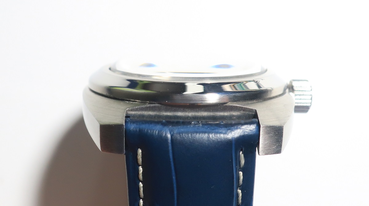 На самом деле цифер темно-синий, глянцевый, с эффектом sunburst. То, что на фото кажется секторами — на самом деле постоянно перебегающий по циферблату в зависимости от угла зрения перелив. На читаемость отсветы не влияют никак, потому что прорезные цифры и блестящие полированные стрелки видны под любым углом. Ремешок с белой отстрочкой подобран в тон часам, и в целом синяя версия гораздо интереснее и наряднее черной. ПАМфибия вряд ли будет единственными часами, так что как must have я обозначил бы именно синюю модель.