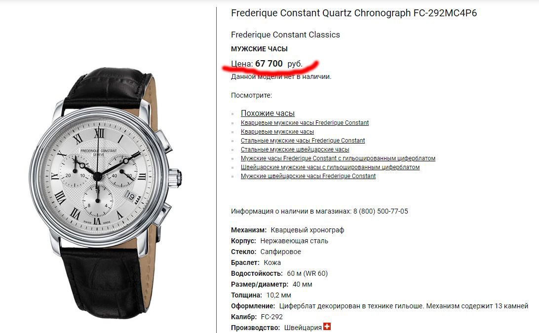 Калибр: FC-292 (Ronda 5030.D, 13 камней)