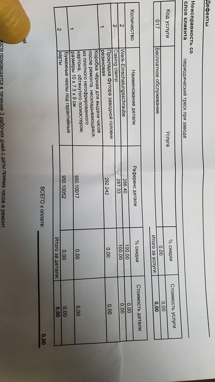 • повреждения (внутренние и внешние), вызванные любым внешним механическим воздействием, ударными или вибрационными нагрузками, применением внешней силы к частям изделия (разбитое или выпавшее стекло, трещины, царапины, задиры, сколы, деформация материалов и деталей, слом, выгибание оси переводной головки, искривление осей колес и баланса, деформации пластин, разрыв или растяжение деталей, отрыв ушек корпуса для крепления браслета и т.п.);