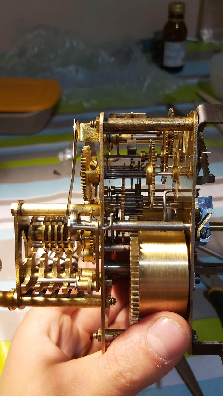 Довольно необычно сделано переключение между "обычным" боем и мелодией - шестеренки с запилом по краю, что имеет эффект "сцепления". Потратил пару часов пока добился идеального сочетания всех шестерней друг с другом. Как я понял, изначально поломка была в обрыве кончика в пружине боя, но по ходу "ремонта" прилично наломали дров...