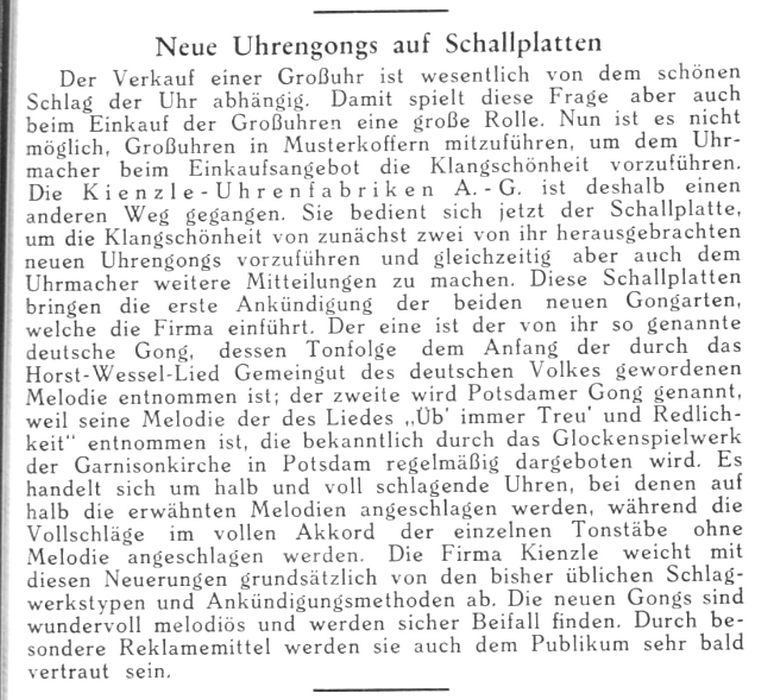 Данная схема боя повторяла перезвон на колокольне гарнизонной церкви в Потсдаме. По воле случая церковь стала определенным символом прихода Гитлера к власти. Хотя по сути мелодия из произведения (вероятно Моцарта), которое посвящено, скажем так, восхвалению жизни в "благочестии и морали". Церковь вместе с колокольней по итогу взорвали. Да и часы с таким перезвоном оказались тоже не в чести, особенно в Германии, немцы стараются не вспоминать лишний раз эти страницы своей истории.