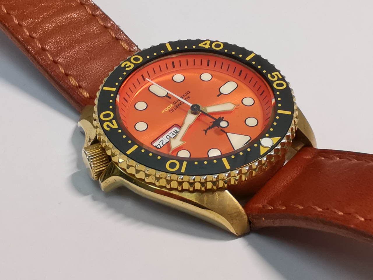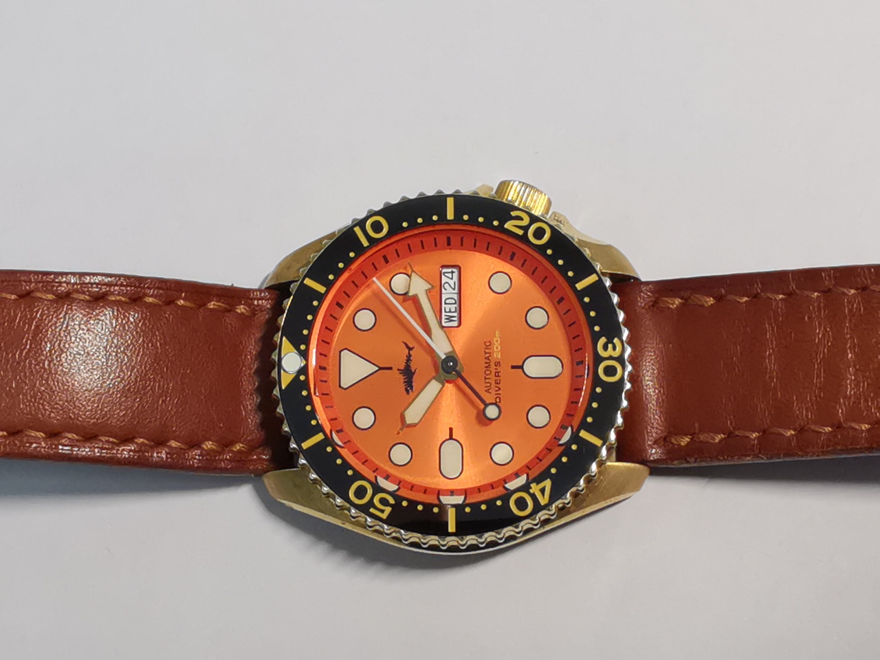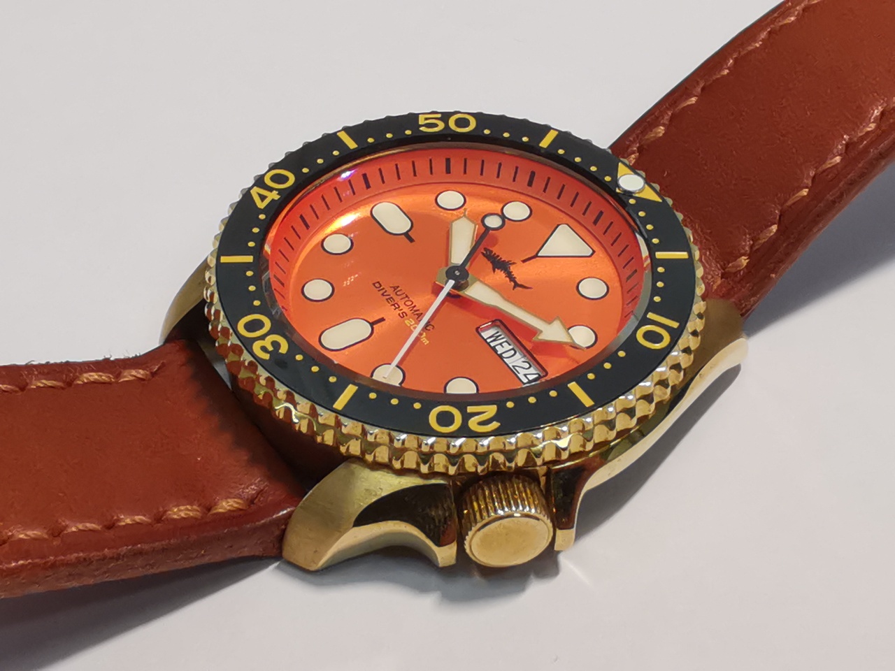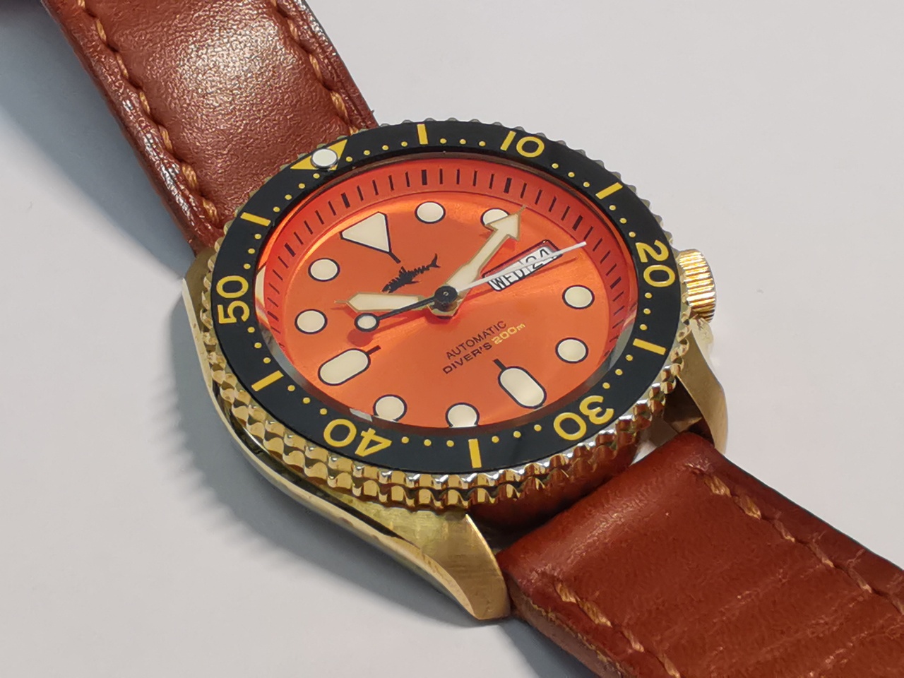 Циферблат оранжевого цвета с радиальным шелковым переливом. На циферблате черной краской нанесен логотип производителя в виде рыбы похожей на акулу, и надписи: automatic, diver's 200m. Окошко даты и дня недели, вытянутой, прямоугольной формы, оформлено черной рамкой. Минутная шкала оранжевого цвета, вынесена отдельным кольцом над циферблатом, создает впечатление значительного подъема.