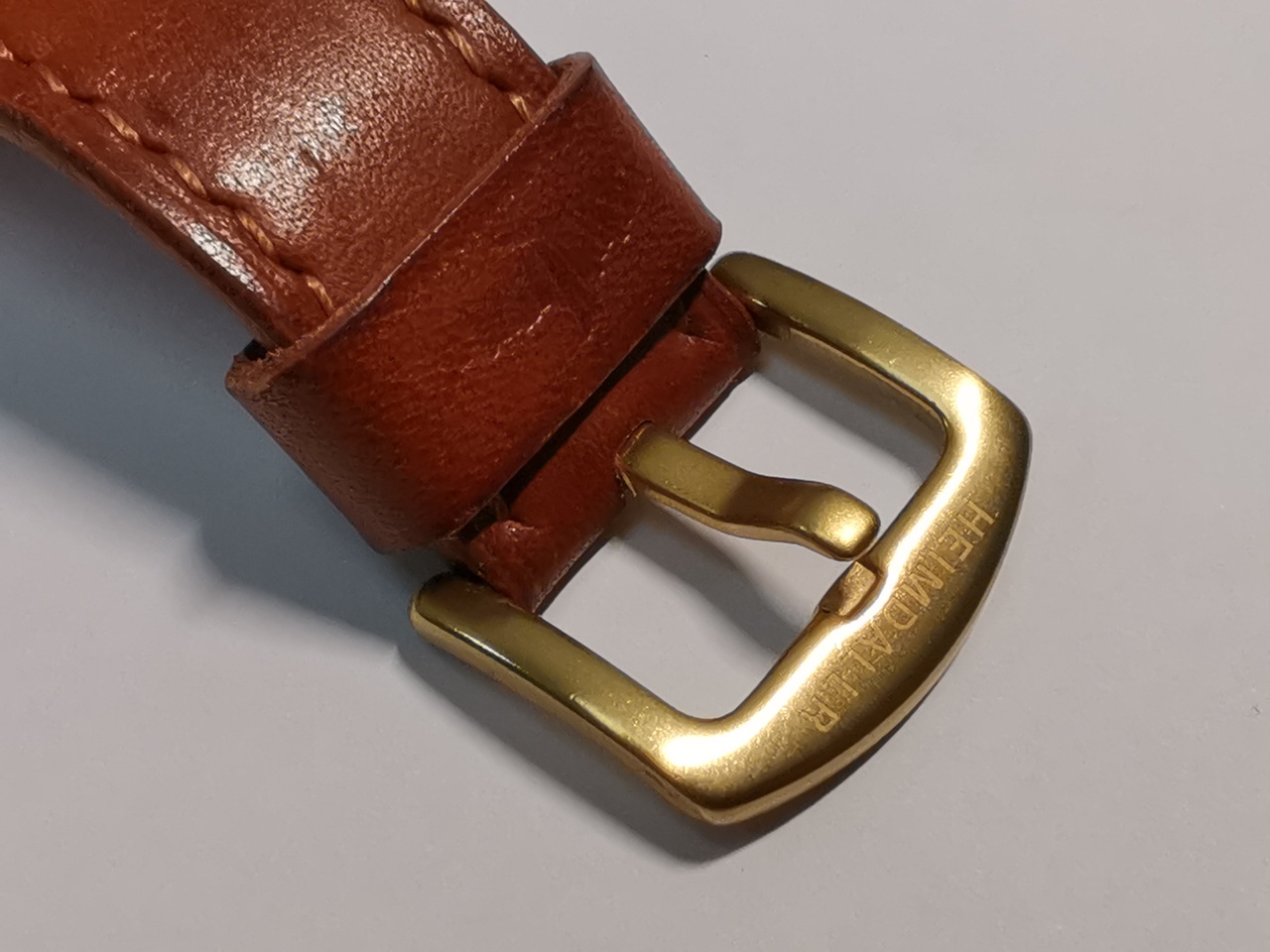 Ремешок установленный на часах изготовлен из кожи, прострочен. В широком месте его ширина 22мм, в узком 20мм. Бакля толстая, вероятно штампованная, имеет гравированную надпись Heimdallr, изготовлена по моему подозрению, из нержавеющей стали с покрытием похожим на цвет корпуса. Ремешок как я упоминал выше имеет сильный запах "кожи" усиливающийся при намокании ремешка или части его.