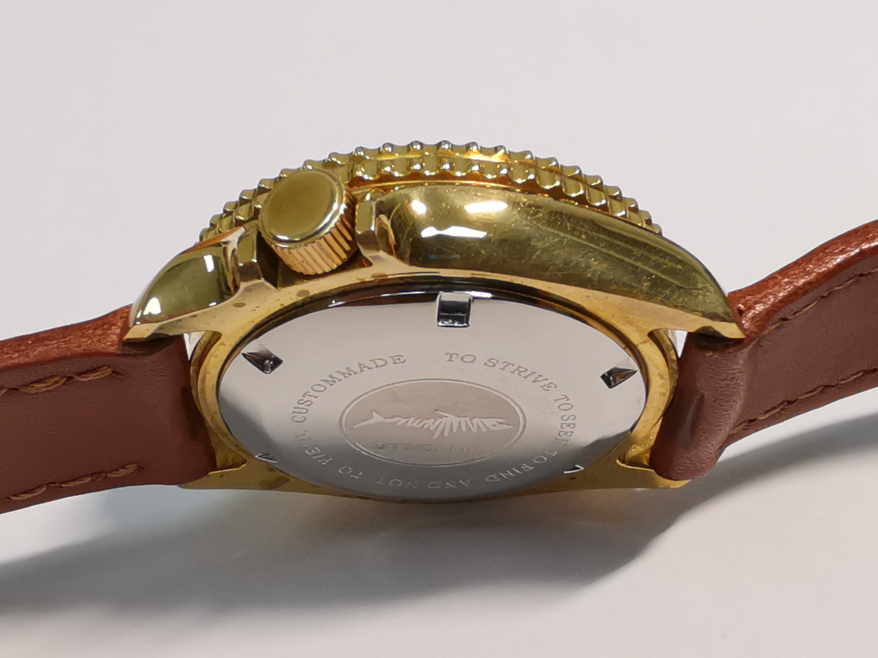 Теперь о самих часах. Корпус часов из алюминиевой бронзы, некрупный, диаметром 41мм, от ушка до ушка 46мм, диаметр с головкой 45мм, между ушек 22мм, толщина 13мм. Корпус хорошо полирован со всех сторон, кроме верхней, там среднее сатинирование по длине окружности. Между ушек все места тоже хорошо полированы. Острых кромок нет даже на внутренних сторонах ушек.