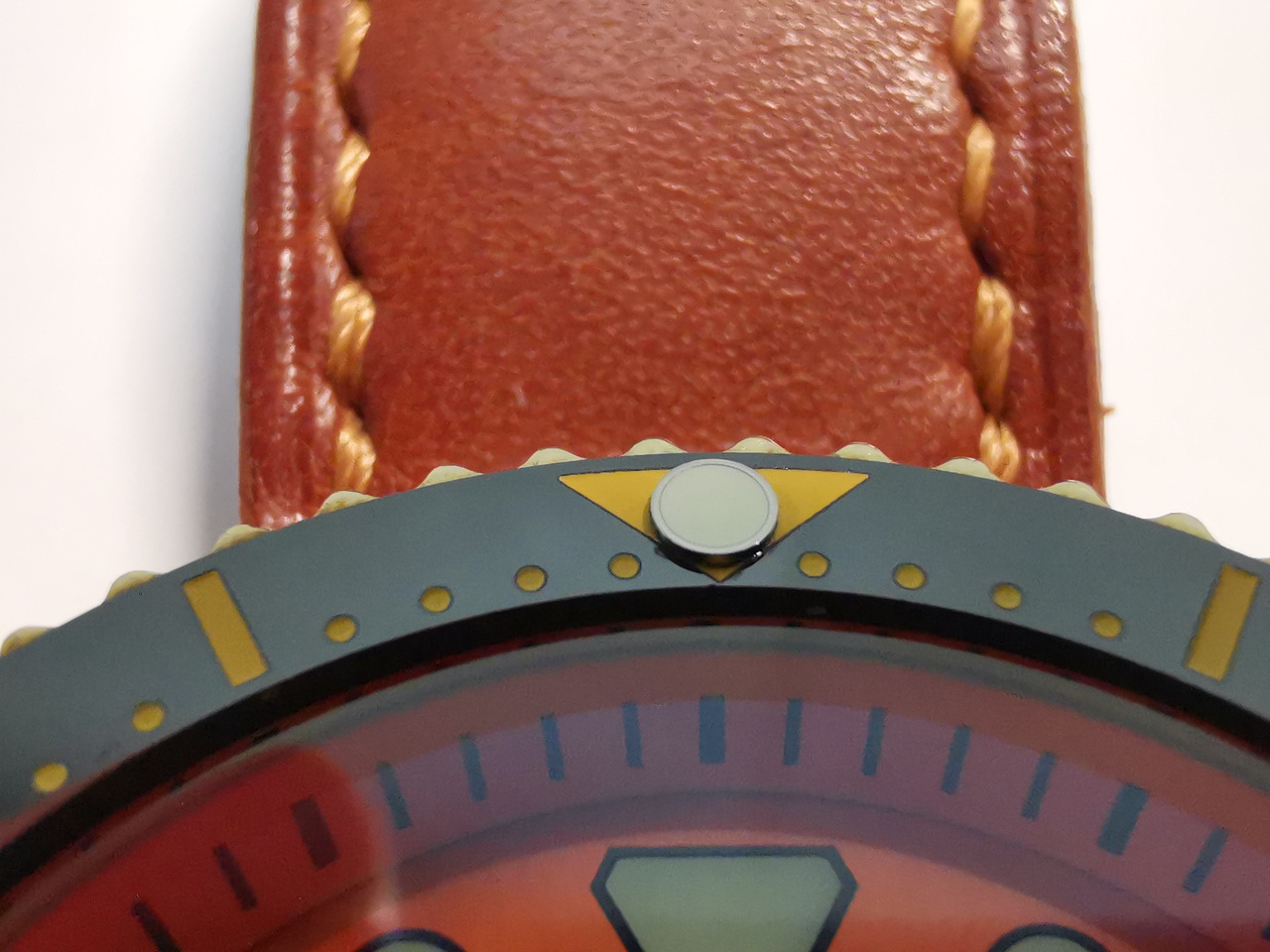 . Далее из неприятного - следы клея на керамическом безеле, удалось оттереть ваткой. Ну и самое раздражающее, это запах от ремешка, он настолько сильно пахнет "кожей", что невозможно игнорировать.(причем, во влажном состоянии запах усиливается)