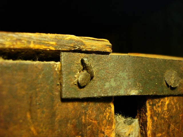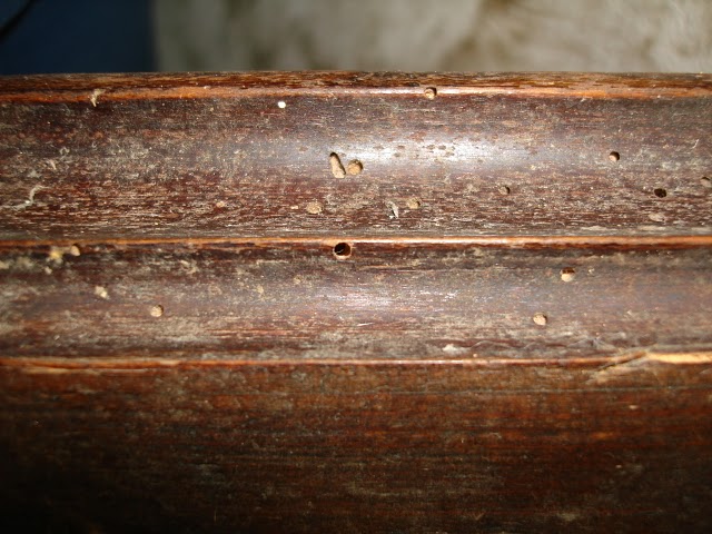 отвалившийся шпон восстанавливаем. Длее раскладывем, смотрим примеряем, все ли в порядке...Далее после мелкой шкурки спиртовой морилкой в нужный цвет каждую детальку без фанатизма, чтоб не скрыть и не испортить текстуру дерева (предварительно протестировав на ненужном дереве, учитываея, что под лаком темнее будет)), склеиваем столярным клеем используя струбцинки и т.д. ПВА лучше не применять (или испоьзовать в исключительном случае). Шурупы при сборке использем в исключительных случаях, тщательно пряча головки. Задняя стенка на шурупах, если есть под них места. При склеивании не торопимся, смотрим, чтоб все ровно было и клей не вылезал. После склеивания проверям на ровность и аккуратность. Далее полируем латунные петельки, покрываем их бесцветным лаком. Корпус аккуратно и быстро покрываем качественным мебельным бесцветным матовым лаком в один слой кисточкой не допуская подтеков (предварительно тоже протестировав лак на ненужном дереве с морилкой, чтоб не испортить работу). После лака темным воском шпаклюем дырки от жука везде где они есть.