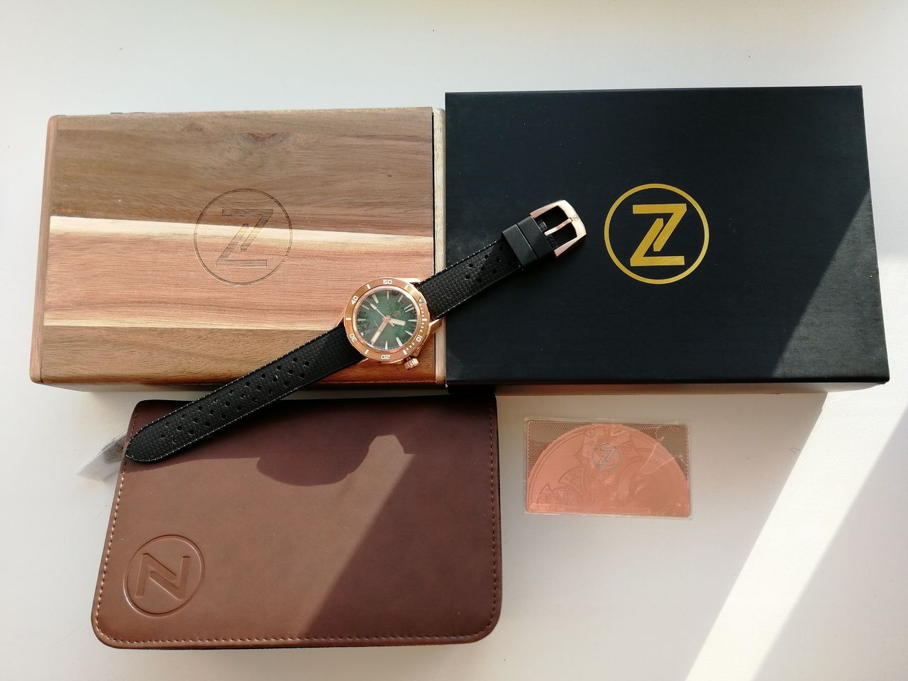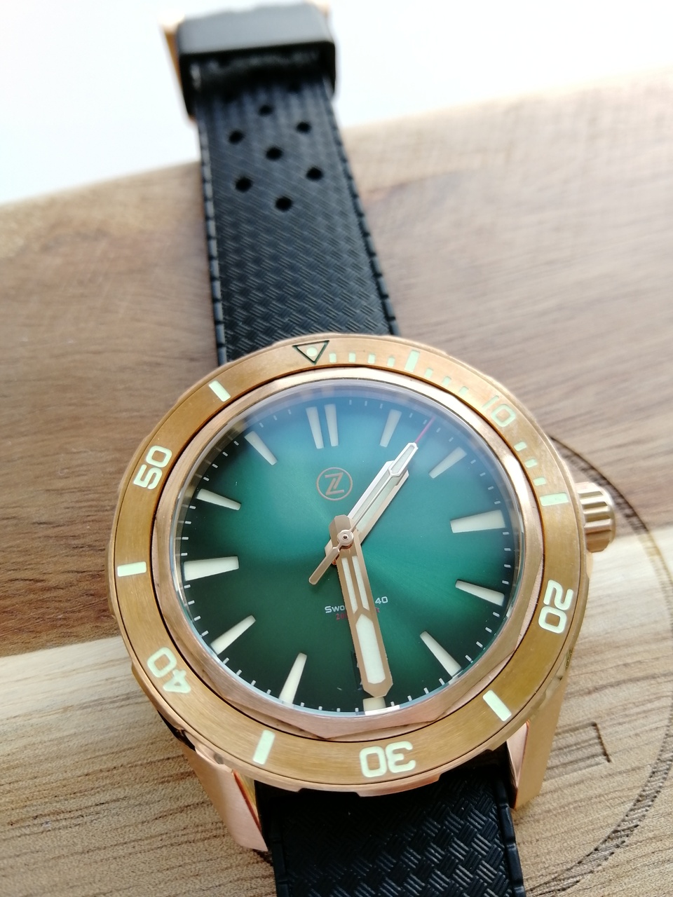 В продаже "правильная бронза CuSn8" от одного из лидеров данного направления - популярного микробренда Zelos. Лимитка из 250 штук, распроданная производителем буквально за пару часов. Часы имеют №65. Шикарный цифер зеленого цвета под сэндвич в живую очень красиво переливается на солнце и вызывает мгновенный "вау эффект". Люм заслуживает отдельного упоминания - супер яркий и долгий, светит как прожектор! Под капотом надежный и проверенный временем NH35A от Seiko. Приятно щелкающий поворотный безель на 120 кликов. Полный комплект: деревянный сундук, клатч для переноски и ремешков, бронзовая гарантийная карта, действующая с апреля 2021 года.