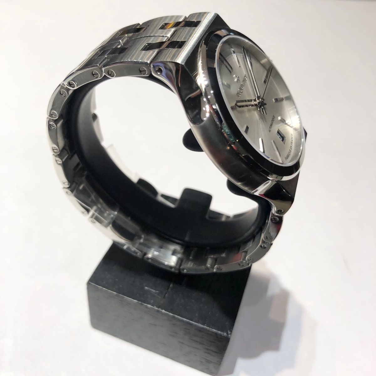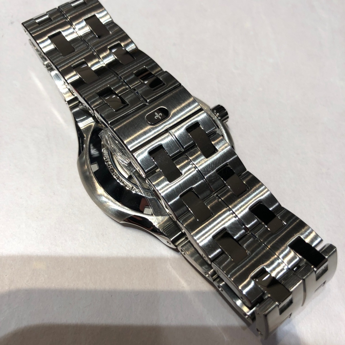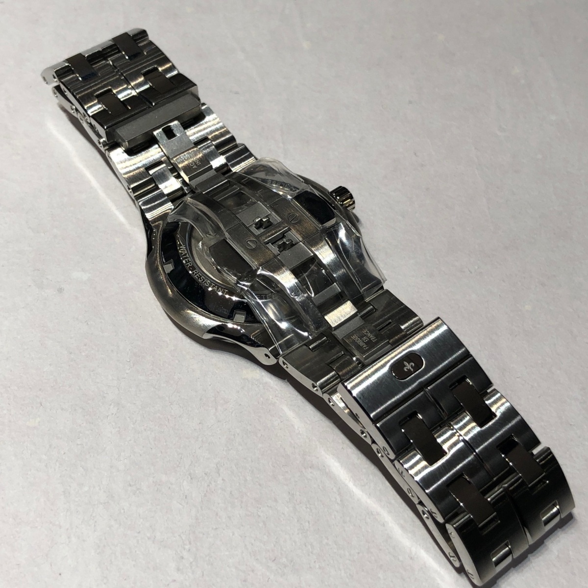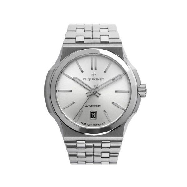 Эта роскошная модель 4900433 имеет корпус из нержавеющей стали 316L, полированной атласной отделкой, диаметром 44,00 мм и толщиной 10,65 мм. Элегантный циферблат серебристого цвета с лучистой отделкой, по которому грациозно скользят центральные стальные минутная, часовая и тонкая секундная стрелки. Окошко указателя даты находится в положении "6 часов". Сапфировое стекло с антибликовым покрытием защищает от царапин. Часы украшает элегантный браслет из нержавеющей стали.