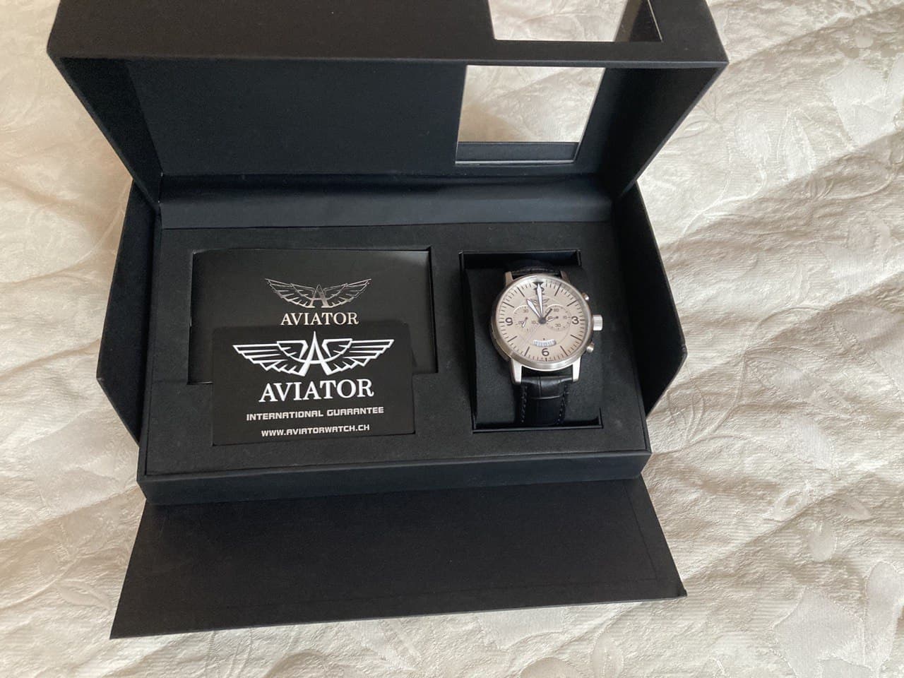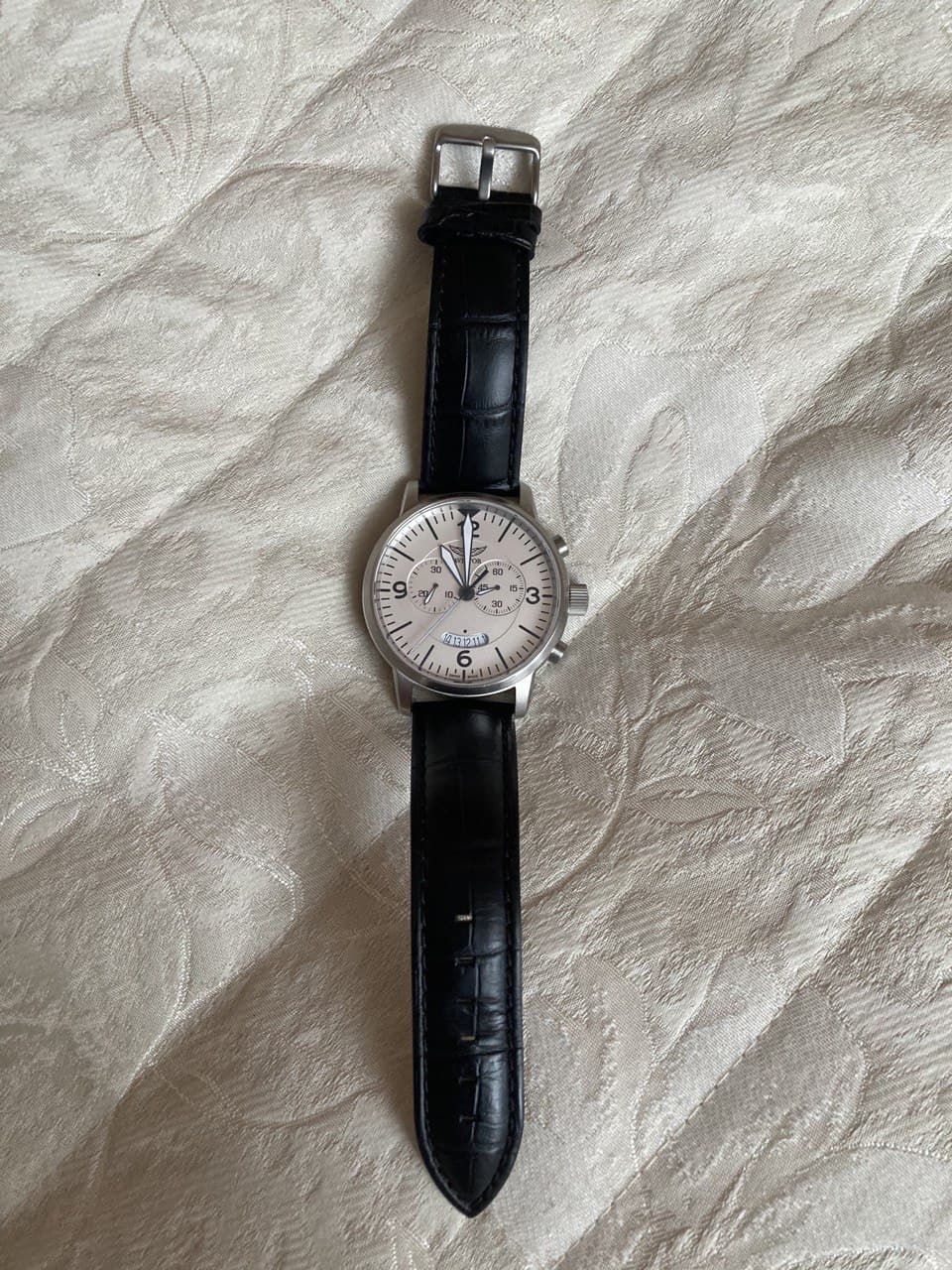 Продам часы Aviator V.2.13.0.075.4 Airacobra Chrono с хронографом. Покупались в подарок близкому родственнику 23 октября 2014 года в Alltime, но он толком не успел их поносить. Сразу оговорюсь, что, будучи неопытным человеком, могу ошибиться как в указанном состоянии (ремешок имеет следы носки, но сами часы без единой царапины - не снималась даже пленка с задней крышки; батарейка села), так и с ценой - ориентировался на ценник в 41к в ритейле в данный момент. Буду благодарен за любой совет.