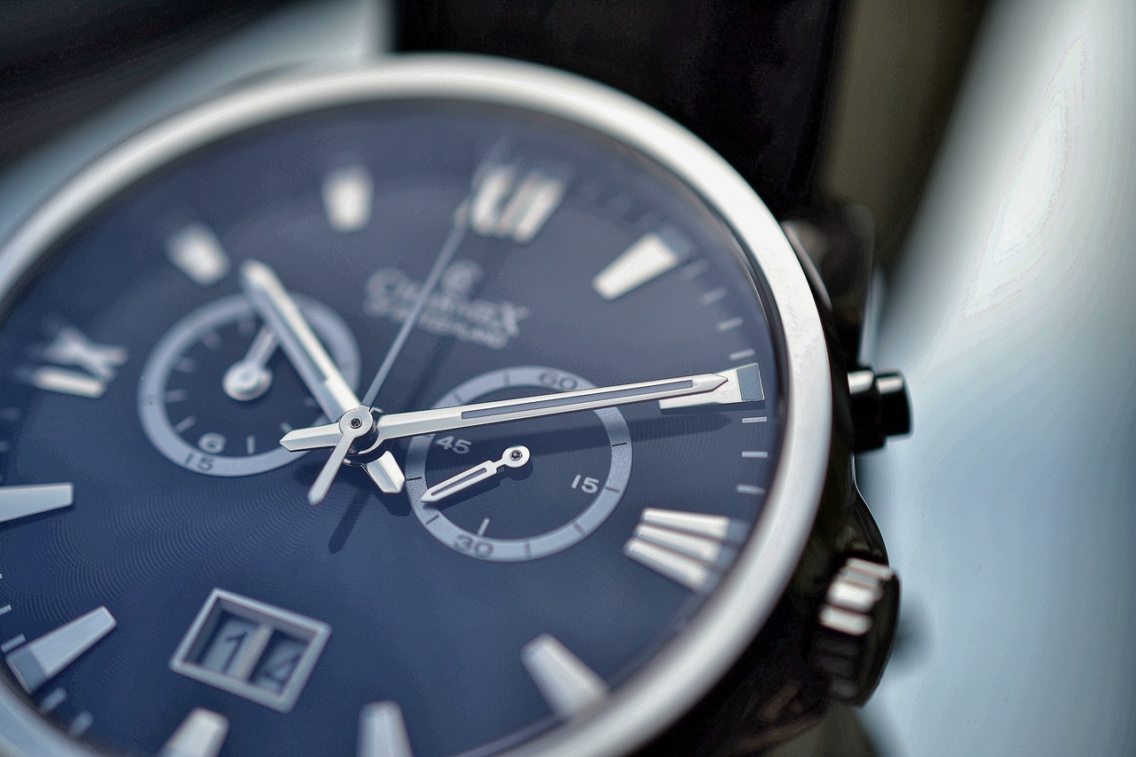 Часы на черном кожаном ремне шириной 24 мм, раскладывающаяся застежка с логотипом.