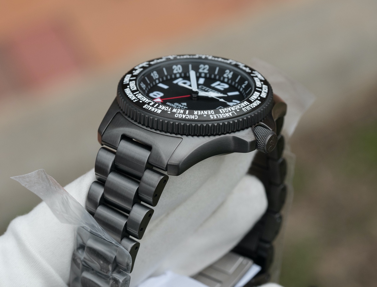 Стальной корпус в стойком ионном покрытии, с сатинированием, выступы для защиты заводной головки