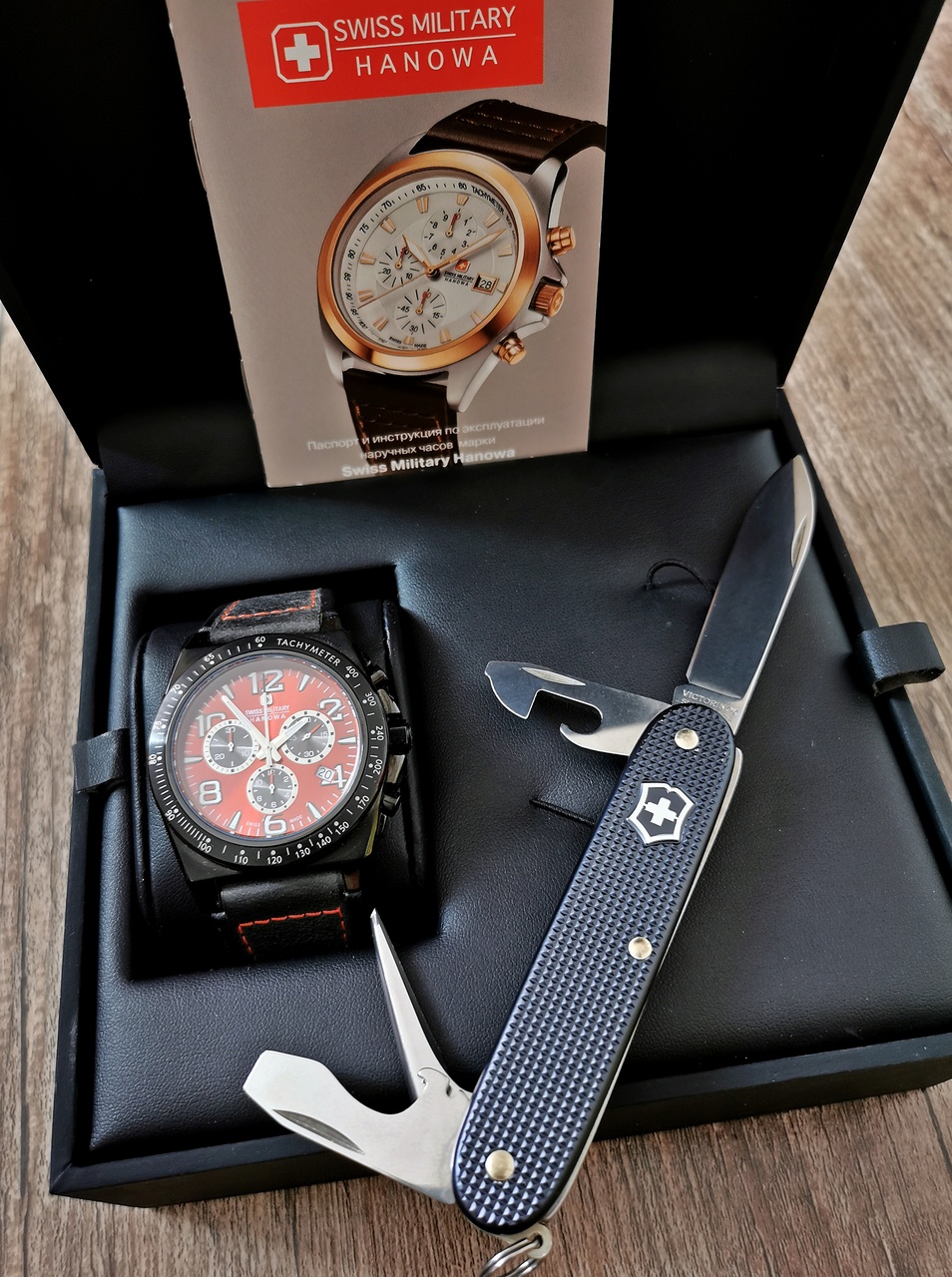 Бонус в виде подарочной фирменной упаковки и раскладного ножа от Victorinox. В магазине цена одних часов только 19т.р..